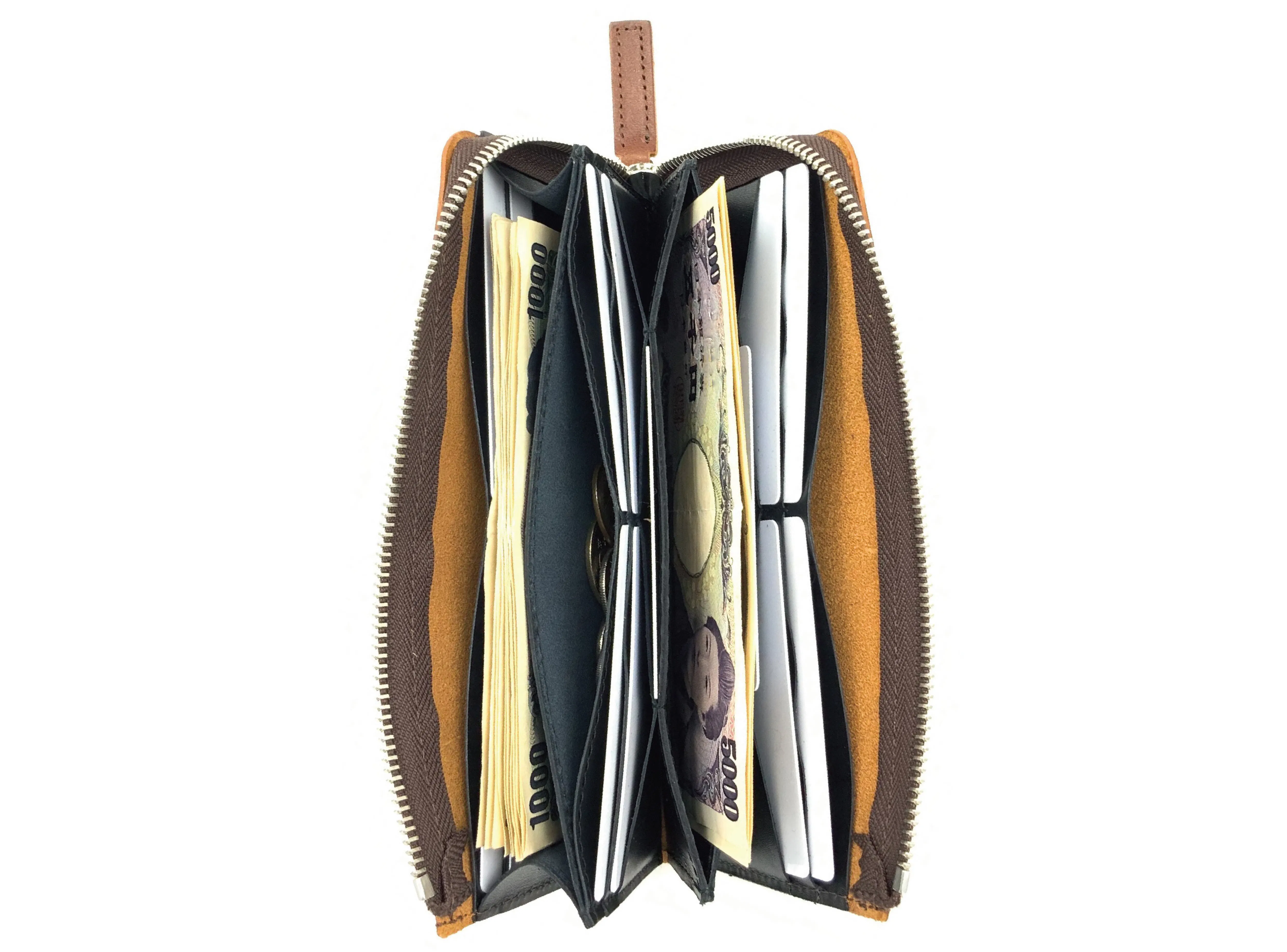 ファスナーを開ければ、財布自ら孔雀のように広がる構造。