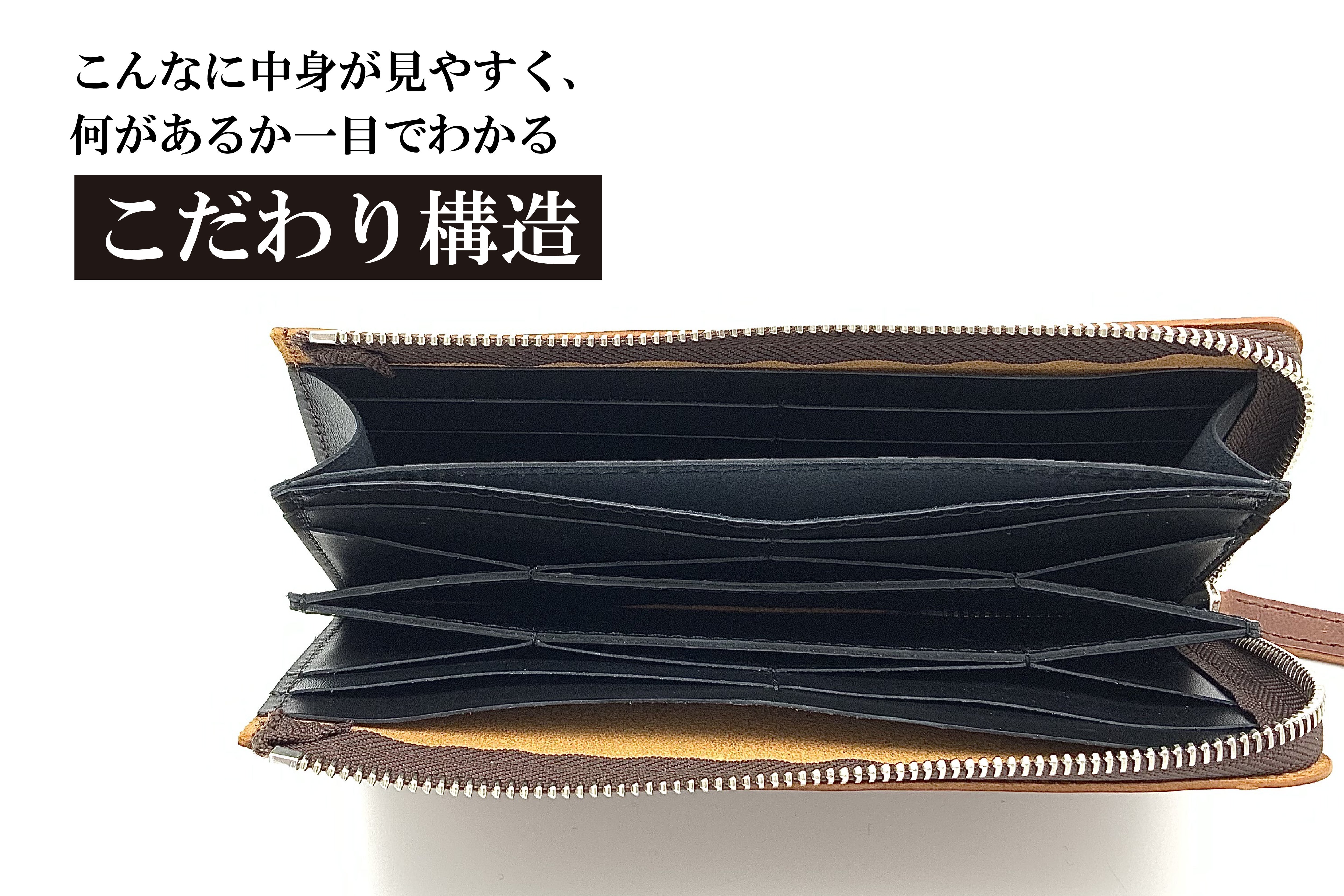 お札ぴったりのサイズと容量の多さと革の質に拘ったL型のファスナー財布。