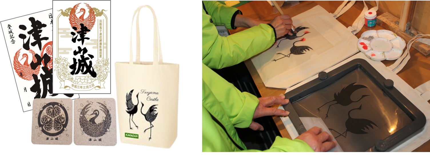 初となるライブカメラの設置を記念して、クラウドファンディング期間中に迎える令和3年3月3日に発行するシリアルナンバー入りの「限定御城印」をはじめ、「家紋入りオリジナルコースター」や鶴のデザインが映える「津山城オリジナルトートバッグ」。一つ一つ、心をこめた手作りです。