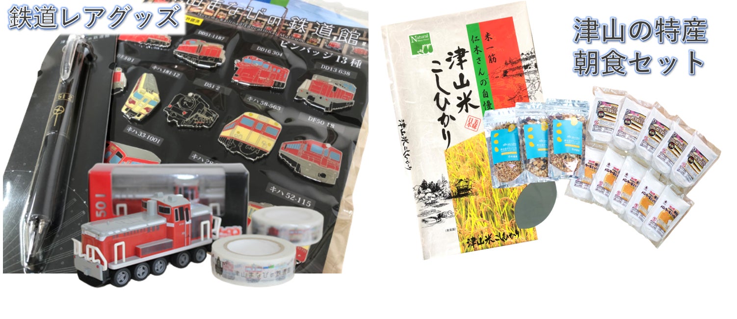 津山まなびの鉄道館レアグッズ(左)津山の特産「朝食セット」(右)