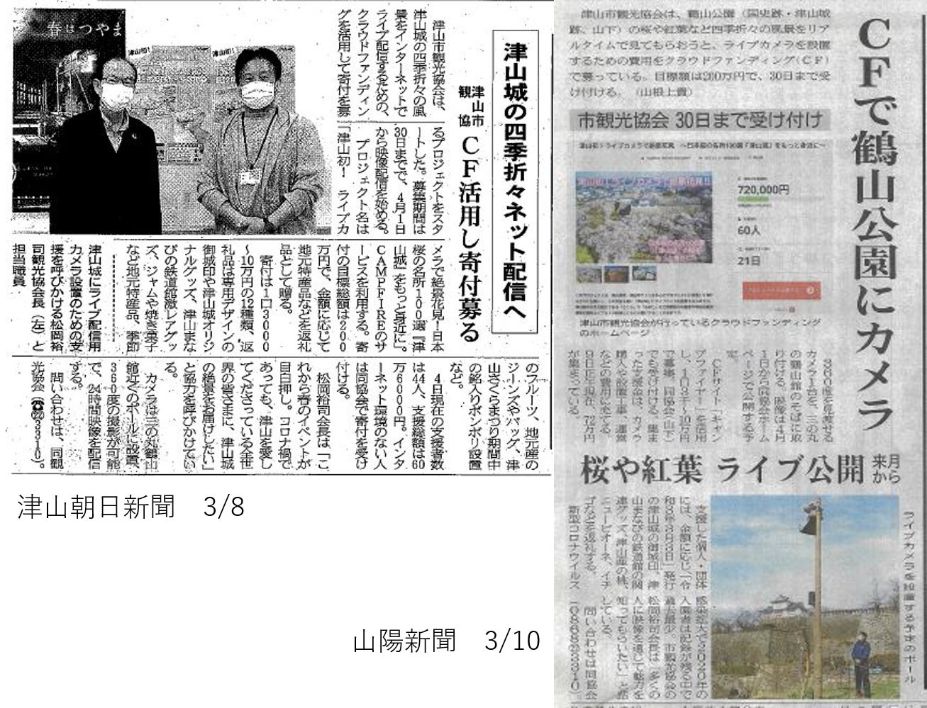 ご覧いただきありがとうございます。プロジェクトスタートから約2週間が経ちました。3月9日現在、60名の方にご支援いただき720,000円のご寄付をいただいております。ご支援ありがとうございます。目標額の2,000,000円にむけて地元メディアからもご協力いただき、3月8日の津山朝日新聞、3月10日の山陽新聞に記事が掲載されました。また3月8日のRSAラジオでもご案内させていただきました。3月11日にはラジオ関西で10時45分から「岡山けんほく ハッスル情報」でも出演しますよ! 放送圏の方は聞いてやってくださいね!津山ではいよいよ「さくらまつり」の開催にむけて動き出します。コロナ対策と、どう向き合えるかが要です。頑張ります!