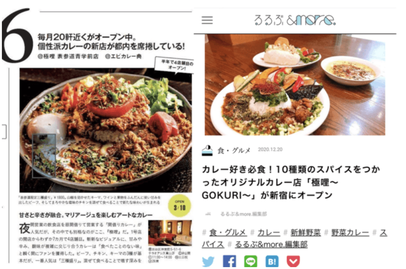 見た目の華やかさに加え米の炊き方、素材から作り方まで全てにこだわり作り上げたカレーがカレー通の中で大人気となり飲食店未経験者が4ヶ月で4店舗展開という快挙を成し遂げた背景から数々のメディアに掲載された背景があります。