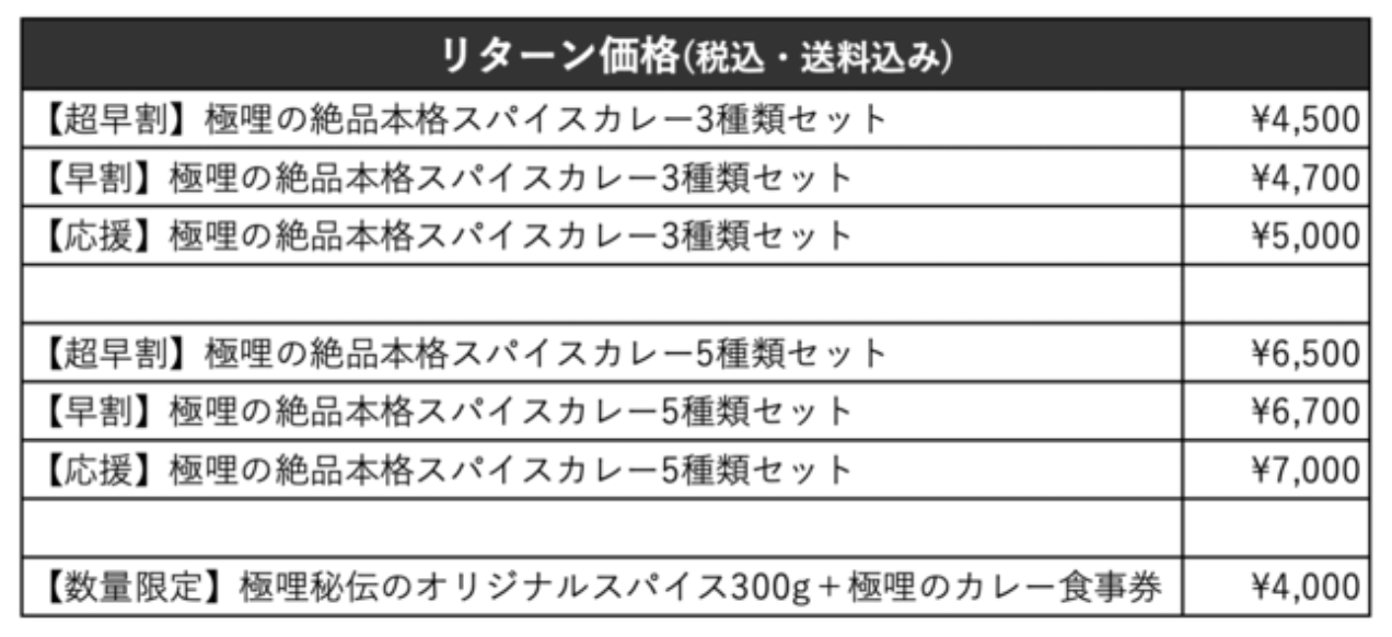 あえてレトルトカレーをリターンに設計しない理由はお店の味に1番近く美味しさが限りなくそのまま届くことで、お店に来られない方でも極哩の美味しいカレーへのこだわりと想いが伝わると思ったからです。