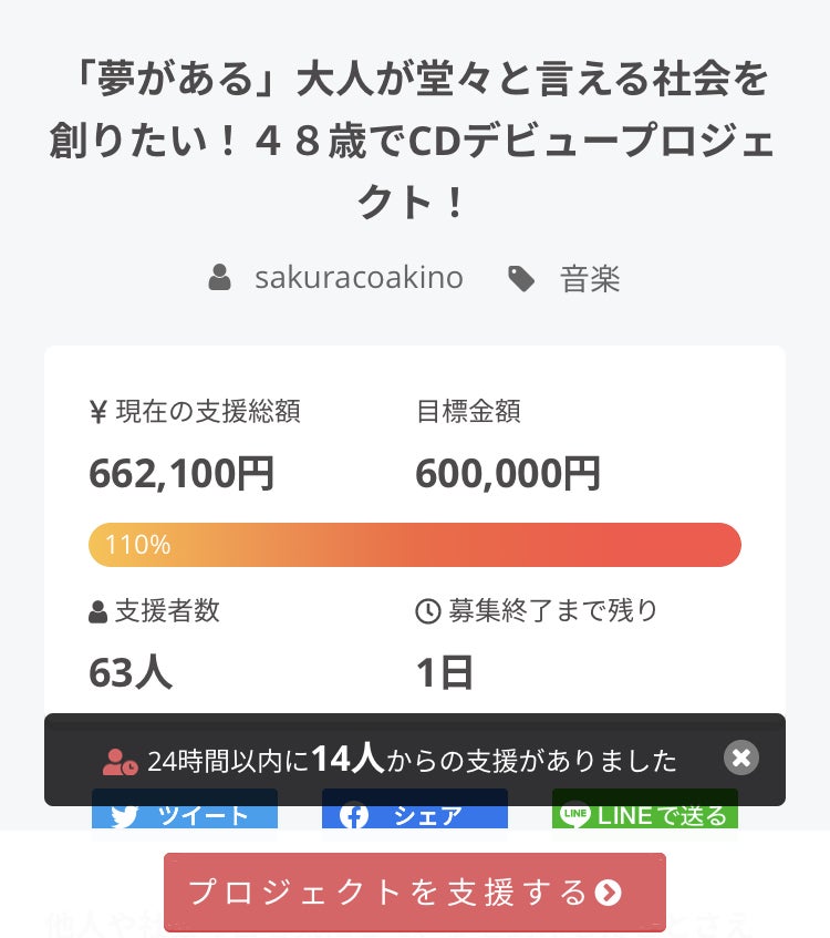2021/03/15 23:23昨夜3月14日の23時59分締切で、目標金額の124%を達成!合計79人の方に応援いただきました! 本当にありがとうございました!感謝感謝です。。 ラスト数日のSNSへの気が狂ったかのような投稿連打、、Facebook動画配信、、、初めてのCLUBhouse、、、 毎日コツコツあっちこっち投稿はしていても意外に伝わらないものだということを知ったのでとにかく、露出を増やしました。 おかげで、目標金額100%を44名の方で達成してから人数チャレンジの段階に入り、ラスト2日半で、なんと、プラス35人の応援をいただくことが出来ました! どうして人数チャレンジしたかというと、なんとなく、ふんわりしか伝わっていなかったこの企画を、この活動を、少しでも多くの人に知ってもらいたかったからです。 そして、大人が堂々と夢を語りその背中を見た子供が未来に希望を持てる社会を創る それを意識する人達が増えたらいいなと思っています。 わたしにできることは、夢のために動く、その苦悩も喜びもすべてありのままさらけだすこと。 笑われてもなんでもいいからカッコ悪いところもたくさん見せていくこと。 今回のクラファンのチャレンジによってそんな使命というか、役割がわたしにできることかなと気づくことがたくさんありました。 本当にチャレンジしてよかった。諦めないで良かったです! これから、この応援に対する恩返しをたくさんしていきますので引き続き見ていてください! 本当にありがとうございました! もっと見る