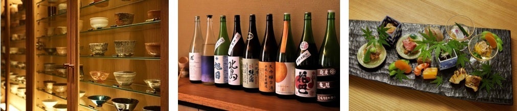 料理ごとに酒の温度の緩急をつけ、それらの日本酒を現代陶芸家の作品や骨董の酒器で提供し、料理・日本酒・器が三位一体となった日本酒の総合芸術を演出。