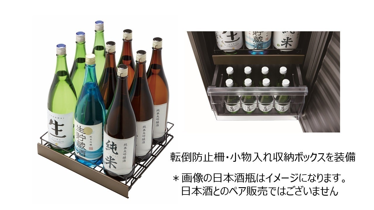 日本酒の横置き保存による過度な酒質の酸化を防ぐ為、四合瓶だけでなく一升瓶も縦置き保管が可能な庫内構造を実現しました。