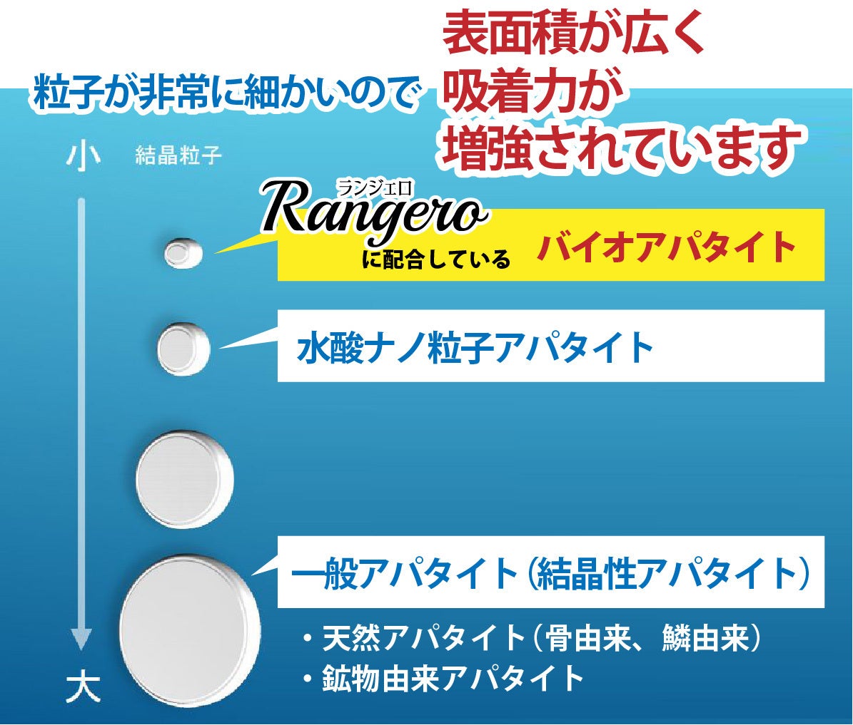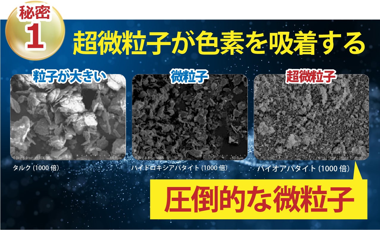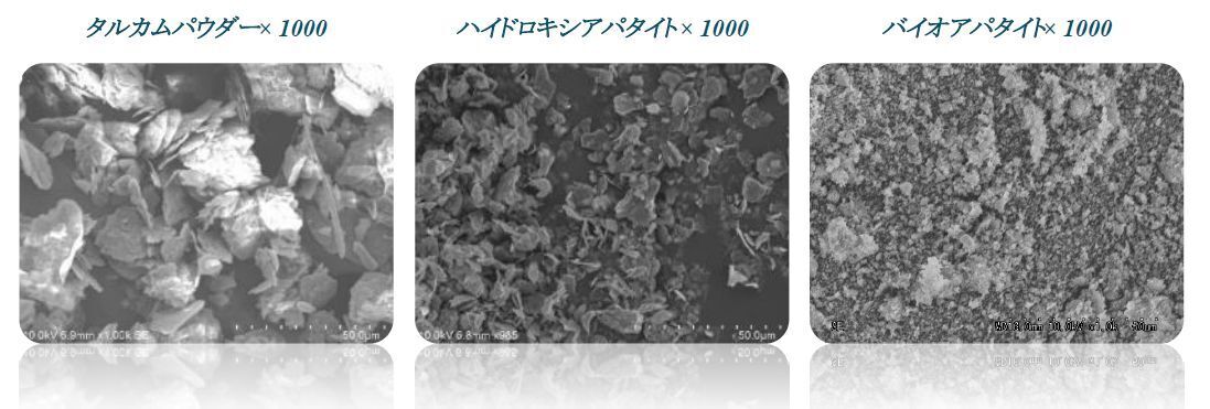 バイオアパタイトはタルク、ハイドロキシアパタイトよりも粒子が細かく、タルクの11倍ものの吸着力を持っています。