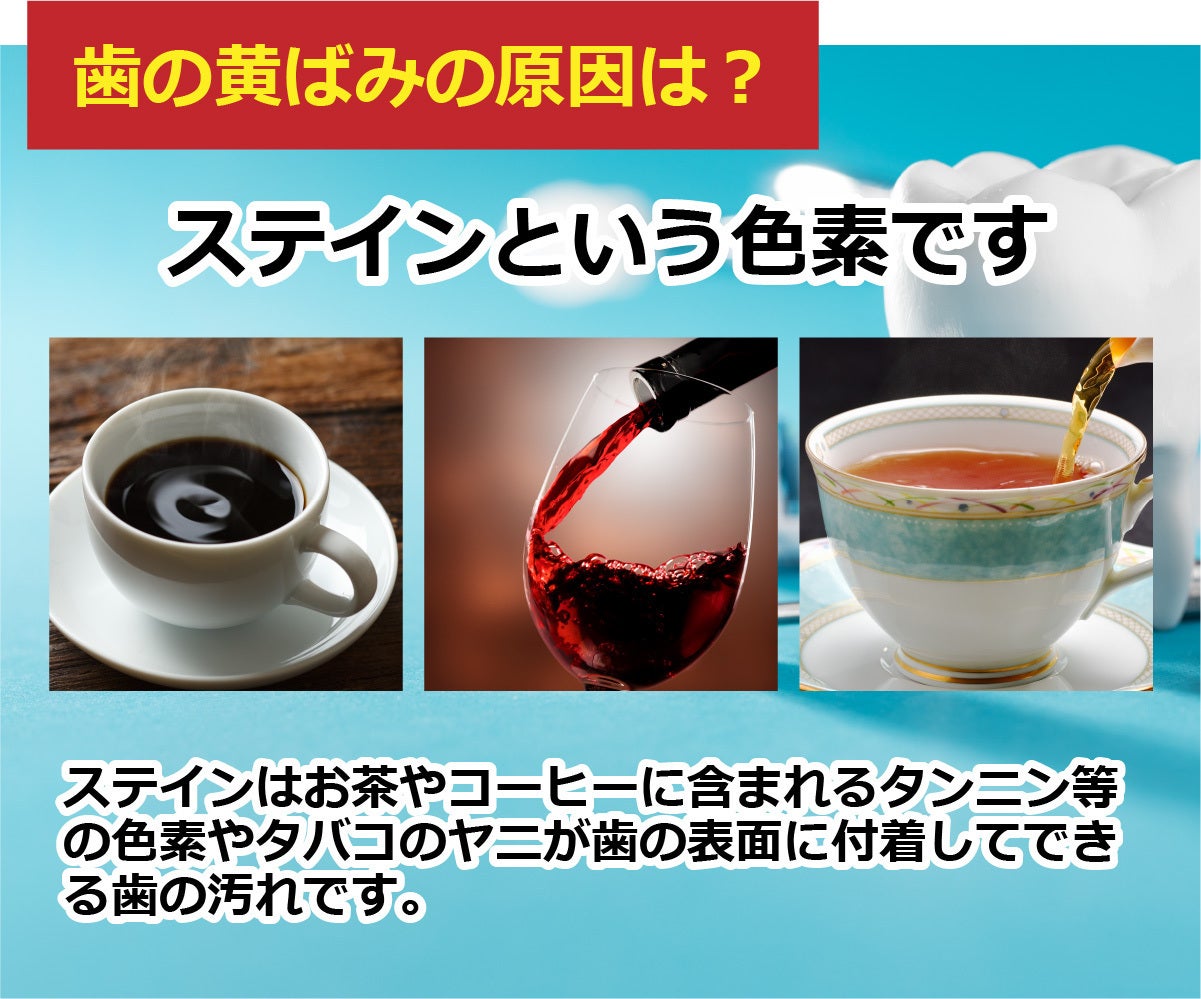ステインはお茶やコーヒーに含まれるタンニン等の色素やタバコのヤニが歯の表面に付着してできる歯の汚れです。時間の経過とともに歯に固着し落ちにくくなるので食後は歯磨きで予防する必要があります。