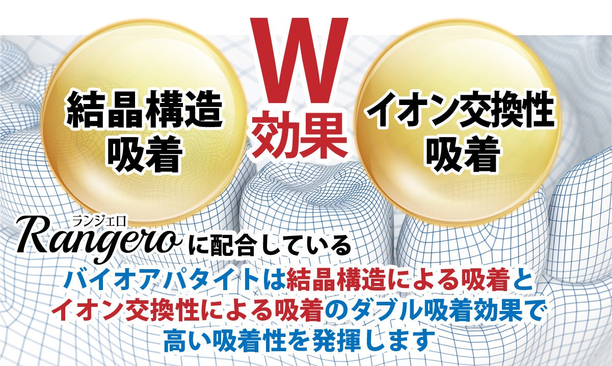 バイオアパタイトは結晶構造による吸着とイオン交換性による吸着のダブル吸着効果で高い吸着性を発揮します