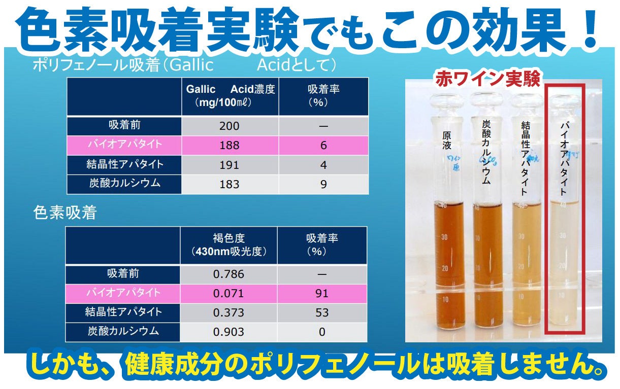 バイオアパタイトはポリフェノールはほとんど吸着せず、色素は吸着します