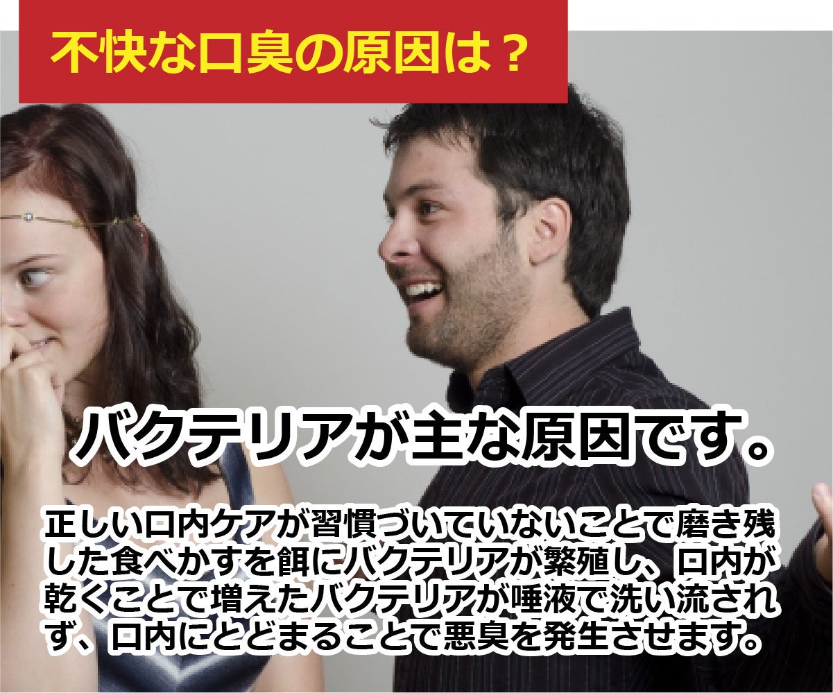 口臭は主に口の中でバクテリアが繁殖することによって発生する不快な臭いです。正しい口内ケアが習慣づいていないことで磨き残した食べかすを餌にバクテリアが繁殖し、口内が乾くことで増えたバクテリアが唾液で洗い流されず、口内にとどまることで悪臭を発生させます。
