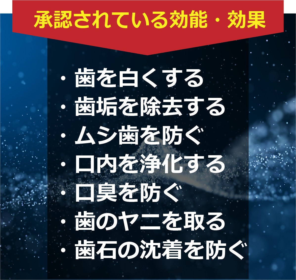 ・歯を白くする/・歯垢を除去する/・ムシ歯を防ぐ/・口内を浄化する/・口臭を防ぐ/・歯のヤニを取る/・歯石の沈着を防ぐ