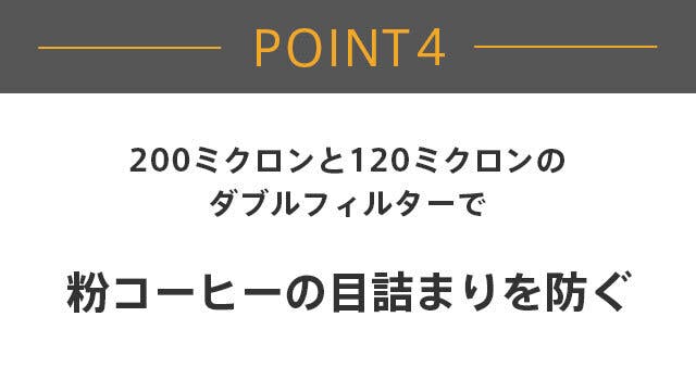 単層式でよく使われる80ミクロンのフィルターよりも水を通しやすいのでコーヒー成分の抽出が早まる上、Wフィルターでコーヒーの粉が外に漏れるのを防ぎます。