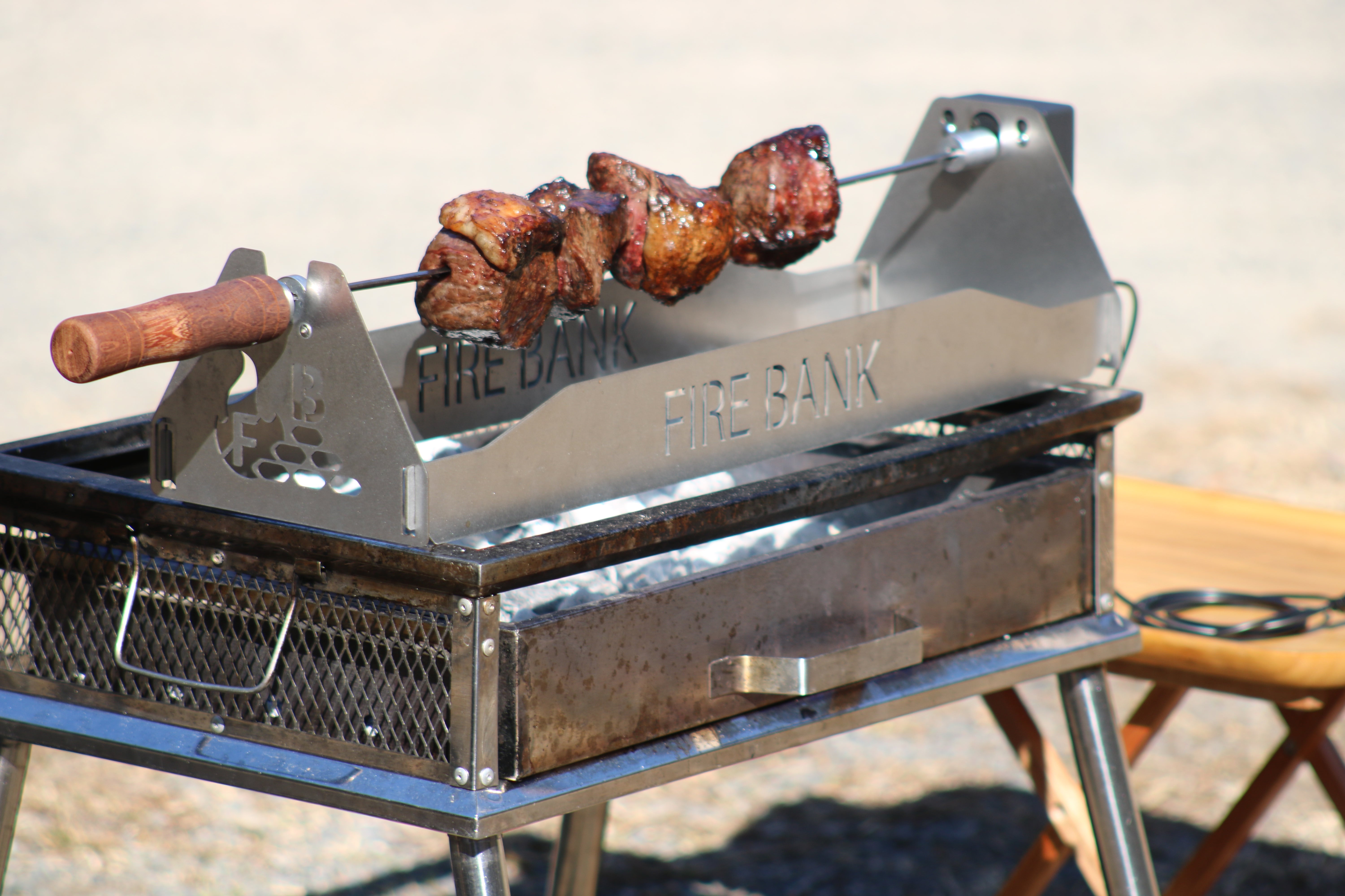 世界初(※)で、日本発!アウトドア用に開発されたロティサリ(自動回転式肉焼き器)の「肉グル」は、牛肉をはじめ様々な食材を自動で焼いてくれる優れものです。一度セットしてしまえば、あとは「肉グル」にお任せ。時間を掛けてゆっくりと焼くことで美味しく仕上がります。お手持ちのモバイルバッテリーを使えば動かすことができるのも魅力のひとつです。材質にはステンレスを採用しているため水洗いできます。最高の焼き加減の塊り肉と「肉グル」を映える写真に収めるために形状にもこだわりました 。(※当社調べ(モバイルバッテリーで駆動するアウトドア用のロティサリとして))