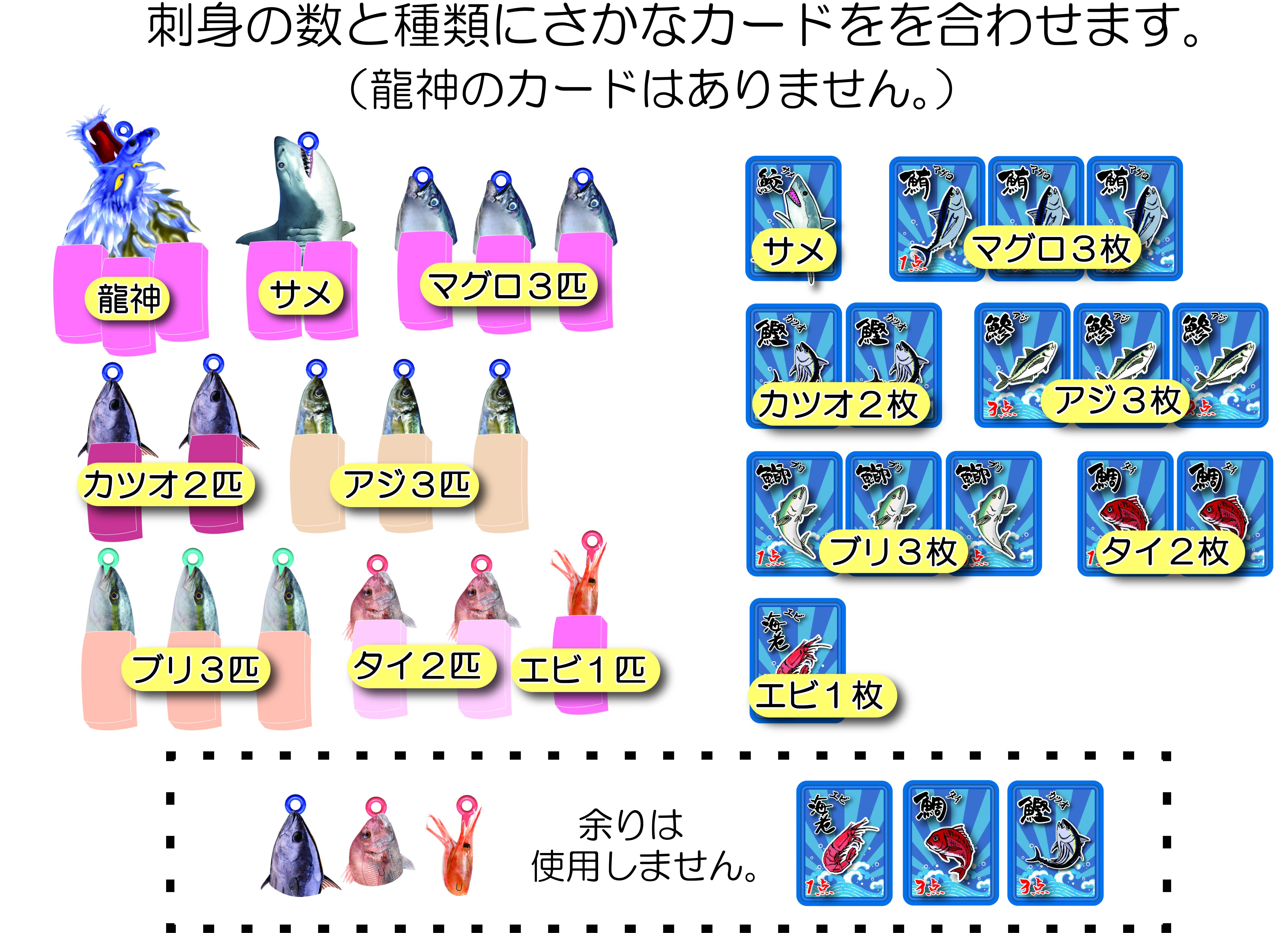 ⑤刺身に取り付けたさかなの頭と同じおさかなカードを場に出し、良く切って裏返して山にしておきます。(すべての刺身にさかなの頭を取り付けた後、さかなの頭が余っていたらそれは使用しません。また、余った魚の頭と同じおさかなカードも使用しません。)