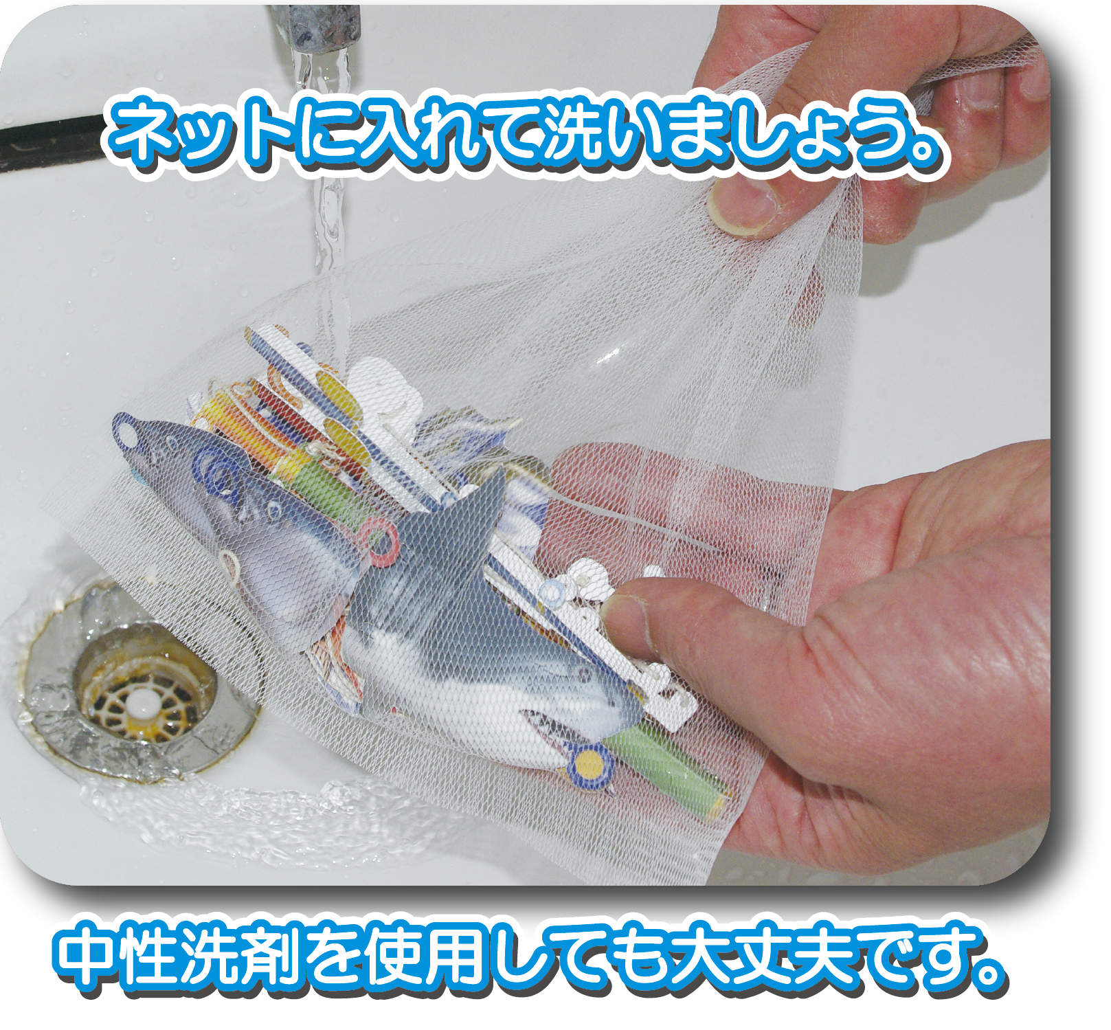 使用したさかなの頭はお刺身の油などついてしまいますが、お家庭にあるキッチンの水切りネットに入れて中性洗剤で洗うと簡単にきれいにできます。ネットに入れたまま放置すれば乾いてまたご使用頂けます。
