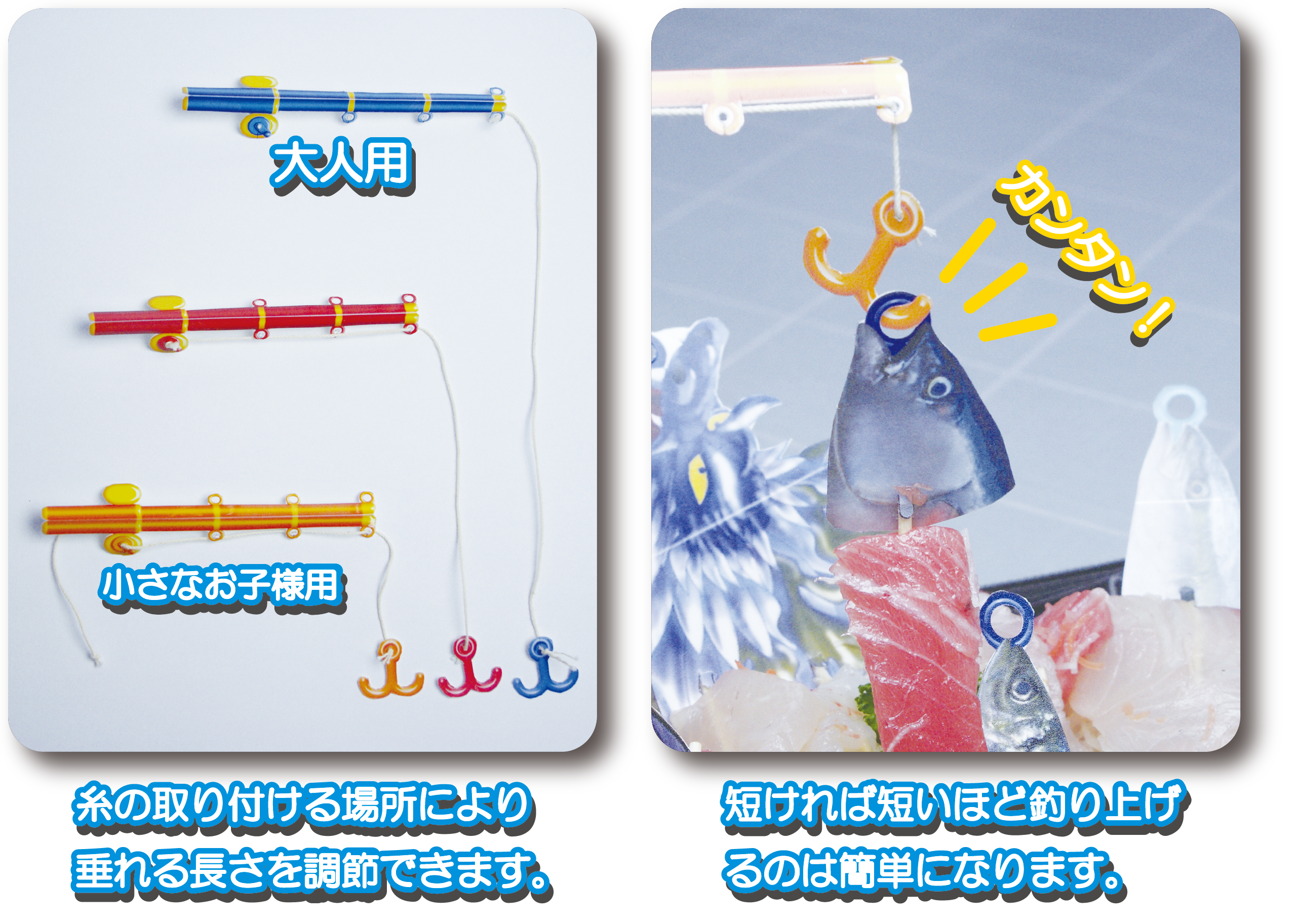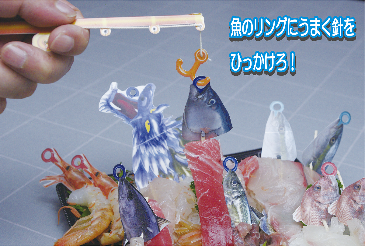 さかなの頭に付いたリングを釣り針でひっかけてお刺身を釣り上げます。