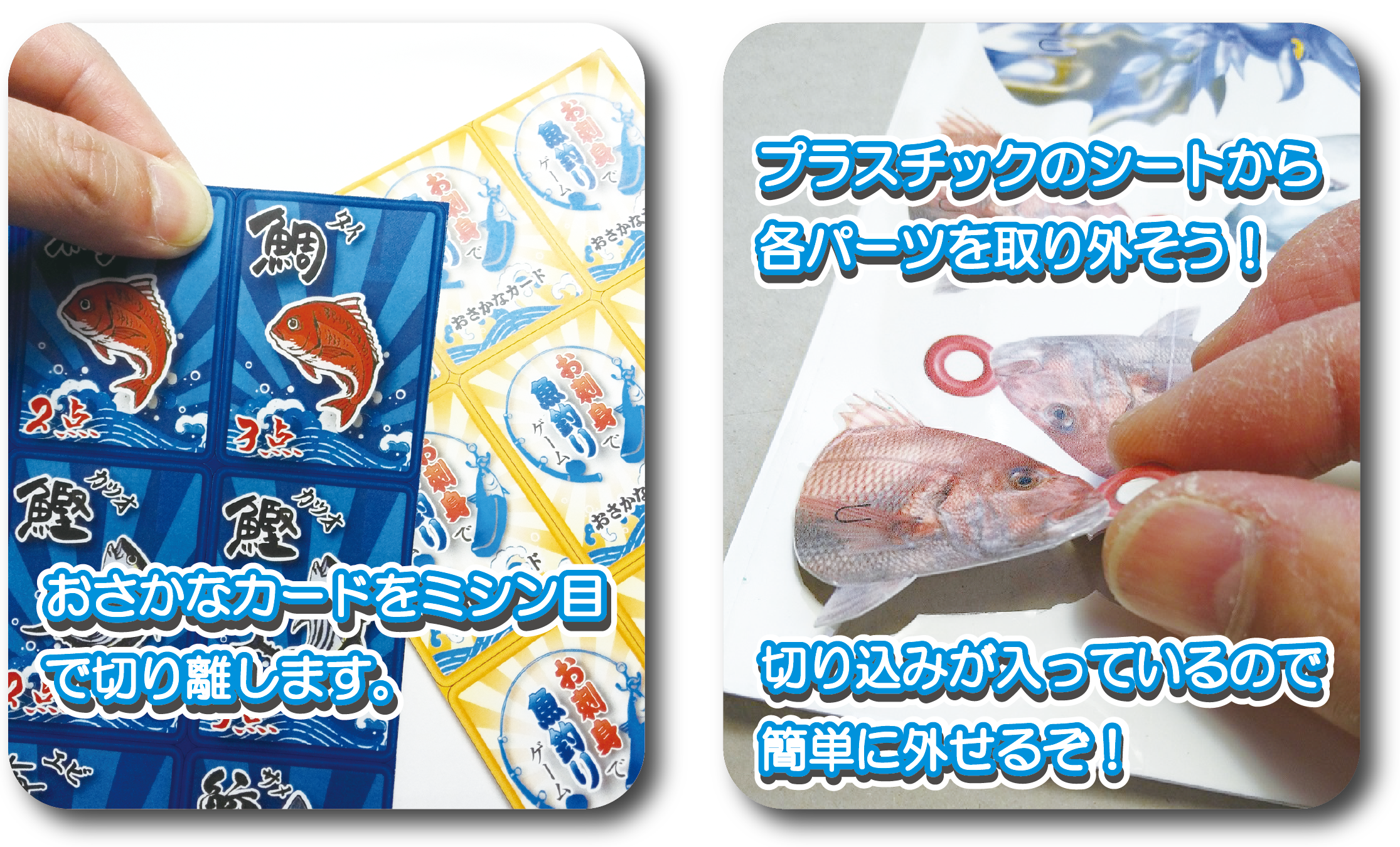 ①おさかなカード、さかなの頭、釣り針、釣り竿をシートから切り離します。