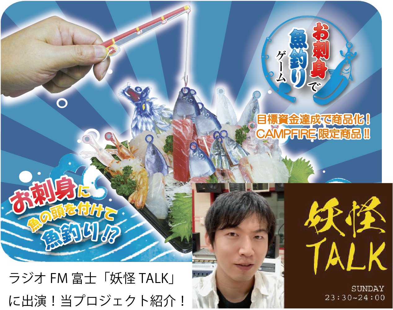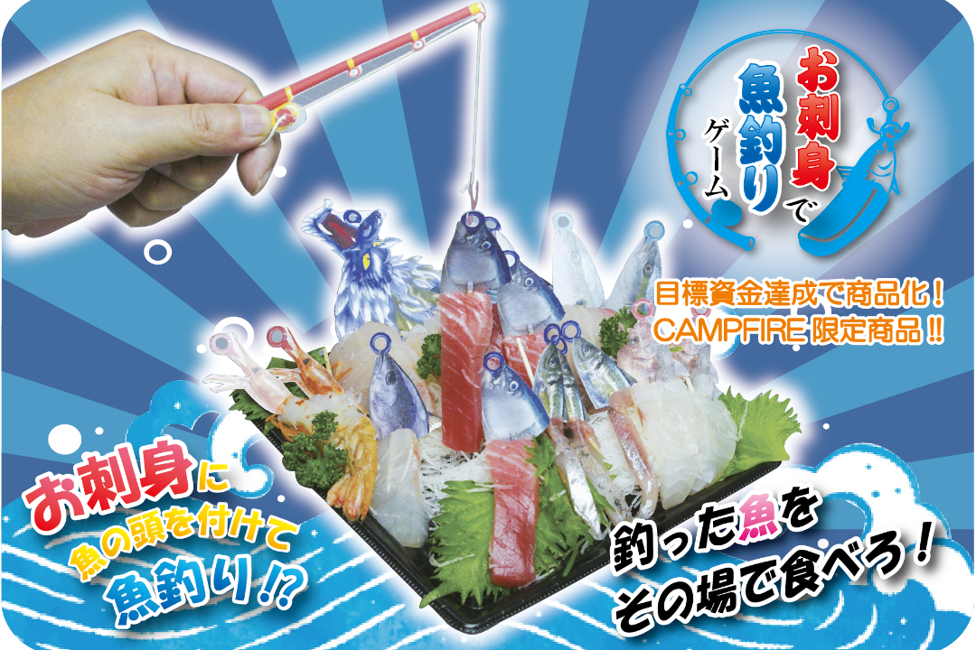 釣った魚をその場で食う!スーパーなどで買ってきたお刺身盛り合わせに魚の頭を楊枝でつけて、皆で刺身の釣り大会!本当に食べられる!楽しい魚釣りゲームです。資金達成でプロジェクト開始の当クラウドファンディング限定商品です!
