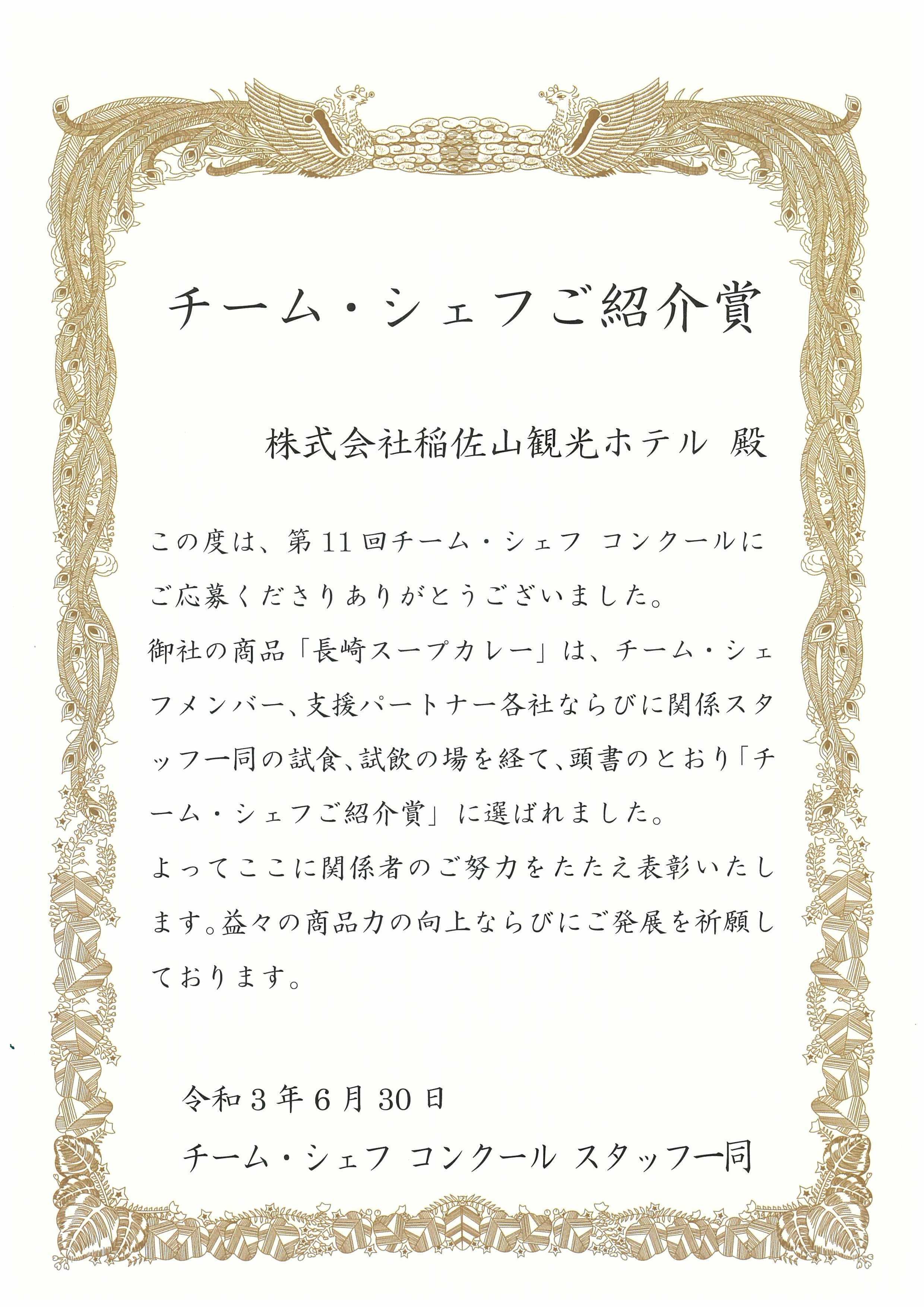 で、「チーム・シェフご紹介賞」を頂きました♪