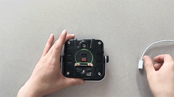 充電方法は、製品の前面の防水ハッチカバーを開け、Micro USBケーブルを充電ポートに接続して充電します。