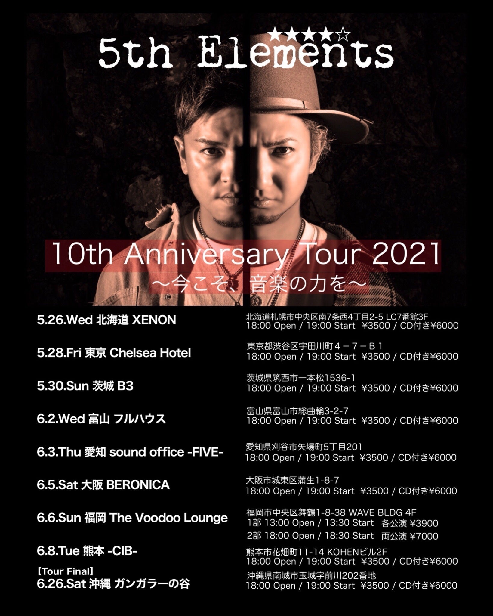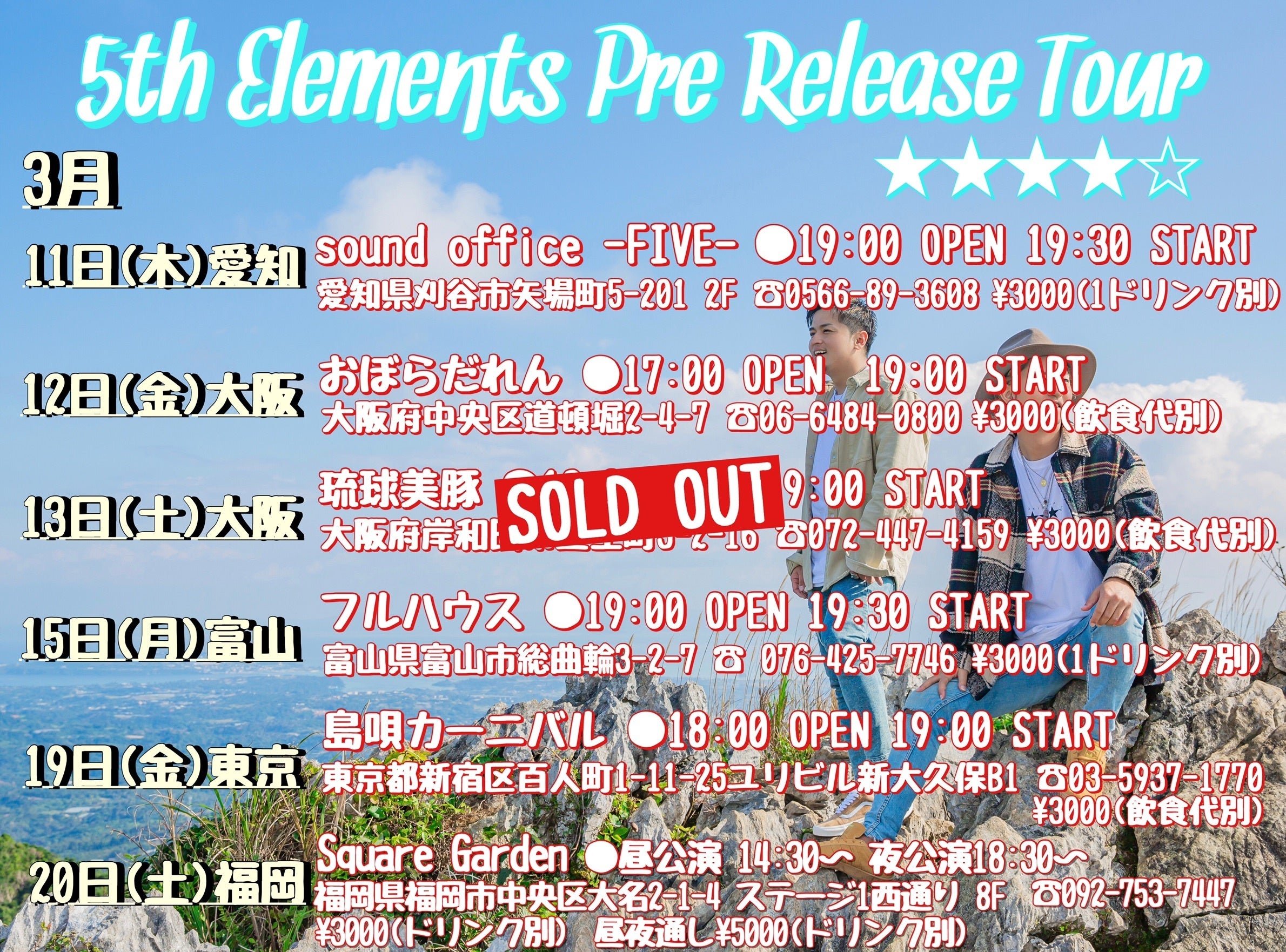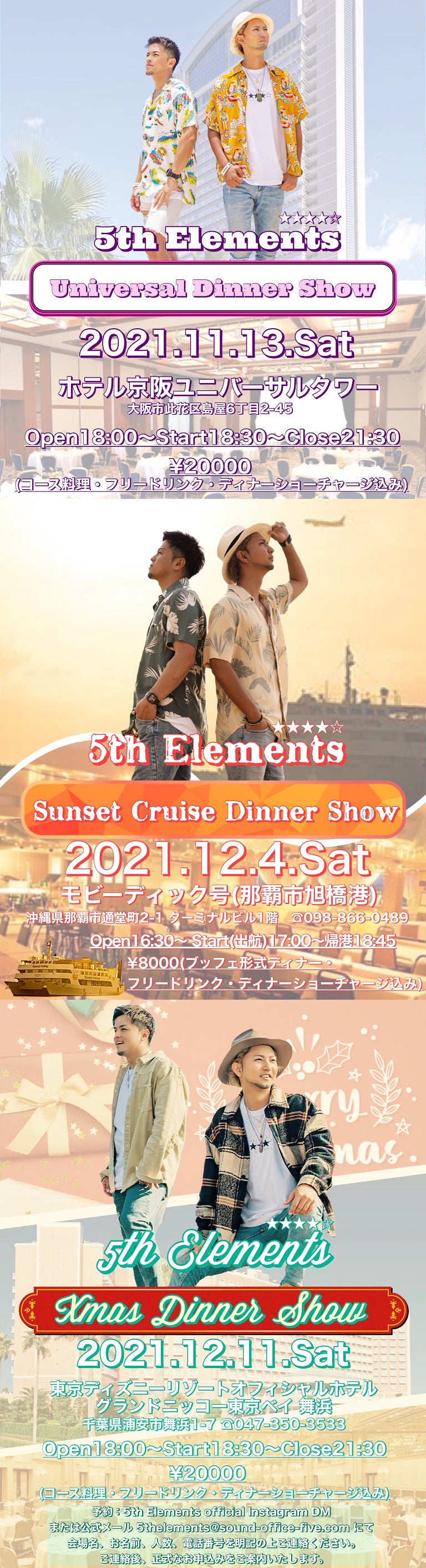 2021/11/03 18:465th Elements★★★★☆10th Anniversary Tour 2021 Vol.2今こそ、音楽の力を≪ 大阪 ≫日程:2021年11月13日(土)場所:ユニバーサルスタジオジャパン オフィシャルホテル ホテル京阪ユニバーサルタワー 〒554-0024大阪市此花区島屋6丁目2-45時間:Open 18:00 Start 18:30 Close21:30料金:\20000(コース料理・フリードリンク・ディナーショーチャージ) (税込)≪ 沖縄 ≫日程:2021年12月4日(土)場所:モビーディック号(那覇市旭橋港)〒900-0035 沖縄県那覇市通堂町2-1 ターミナルビル1階 TEL 098-866-0489時間:Open 16:30 Start(出航) 17:00 Close(帰港)18:45料金:\8000 (コース料理・ フリードリンク・ディナーショーチャージ) (税込)≪ 東京 ≫日程:2021年12月11日(土)場所:東京ディズニーリゾートオフィシャルホテル グランドニッコー東京ベイ 舞浜 〒279-0031 千葉県浦安市舞浜1-7 TEL 047-350-3533(代表)時間:Open 18:00 Start 18:30 Close21:30料金:\20000 (コース料理・フリードリンク・ ディナーショーチャージ) (税込) 【 予約 】 5th Elements official Instagram DM または公式メール 5thelements@sound-office-five.com にて 会場名、お名前、人数、電話番号を明記の上 ご連絡ください。ご連絡後、正式なお申込みを ご案内いたします。 もっと見る
