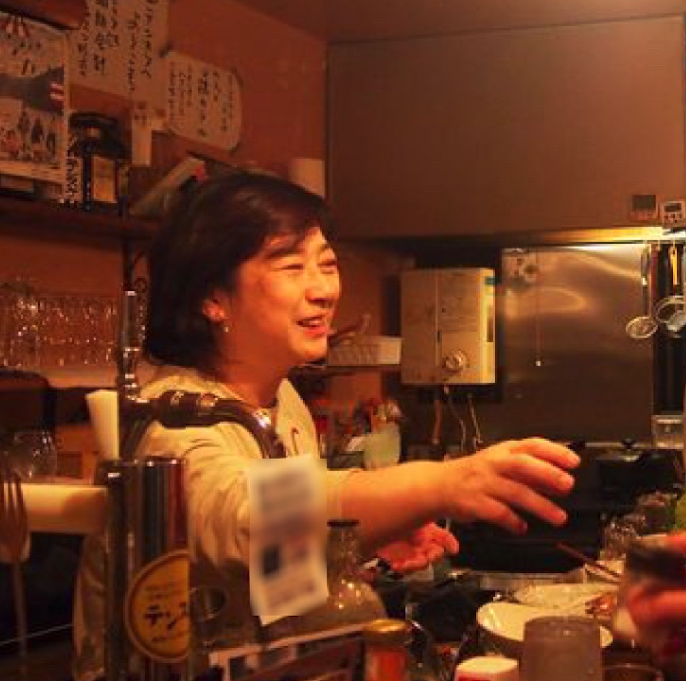 仕事を終え都内から戻ってきた地元民、少しばかりの勇気を出して暖伩をくぐった一見客、帰りそびれ迷い込んで来た観光客。老若男女じつに多くの種類の人間がカウンターに手を伸ばし名物のハイボールを受け取っては喉を潤し、家庭味あふれるお晩菜に舌鼓を打っては、思い思いに店での過ごし方を楽しんでいる。そして人の絶えない全くもって騒がしい(笑)この店で、ひときわ明るく大きな声で店を回しているのがマリコママだ。