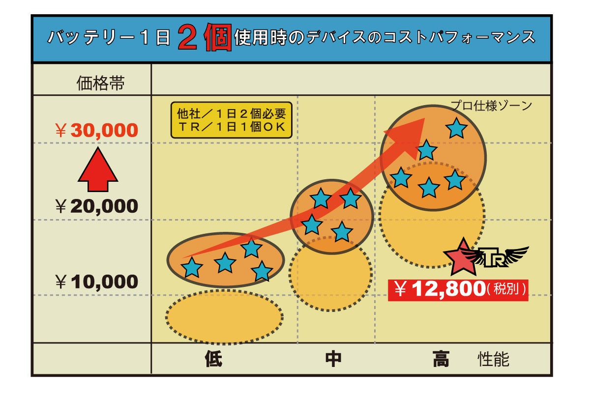 TRバッテリーは、超ハイパワーで長時間稼働を実現するため、通常のバッテリーより重く、大きくなっています。