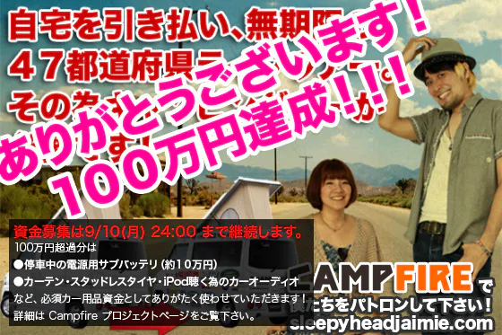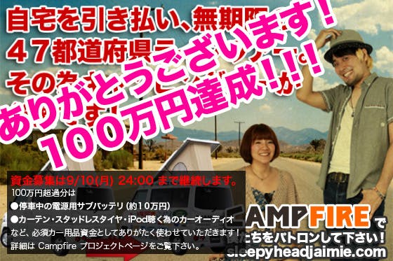 これで無事、僕たちの「キャンピングカーで北海道から沖縄を目指す、ハンバーガー食べ歩き47都道府県無期限ライブツアー」をスタートできる事が確定しました!これで安心してツアーに間に合うように車の購入を進められます!本当にありがとうございます!
