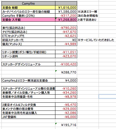 なお、今現在も20万円近く資金が残っておりまして、こちらは定期的に必要となるオイル交換/オイルフィルター交換や、万が一の修理、その他の維持費に使う予定です。カー用品の追加購入は予定はありませんが、させていただいた際にはご報告いたします。