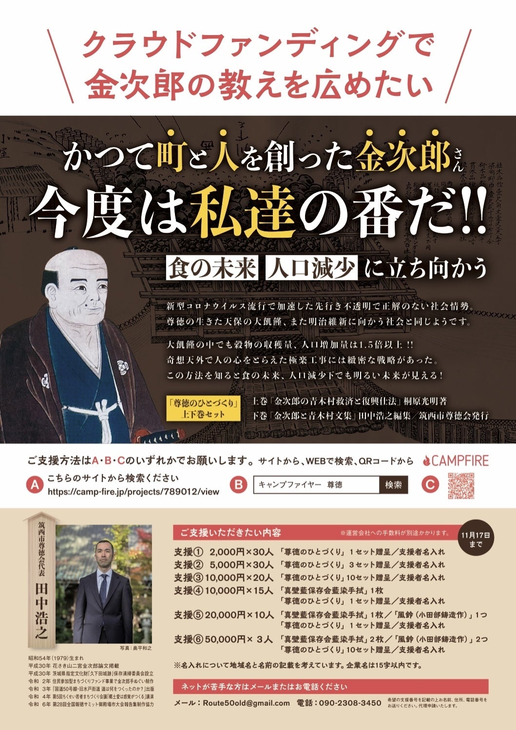 2024/11/06 14:33以前は『国道50号、旧水戸街道、または何を作ったのか?』にご支援頂き、ありがとうございました。 茨城県筑西市桜川市で活躍した二宮金次郎。郷土の偉人の功績をもとに出版活動を行っています。今回はA4サイズの冊子、上下巻120ページ予定です。発行時には巻末に支援者のお名前を入れさせて頂きます!仕上がったものは地元小学校、中学校に寄贈し市内図書館にも置かせて頂く予定です!是非、応援お願いします!!!https://camp-fire.jp/projects/789012/view?utm_campaign=cp_po_share_c_msg_mypage_projects_show もっと見る