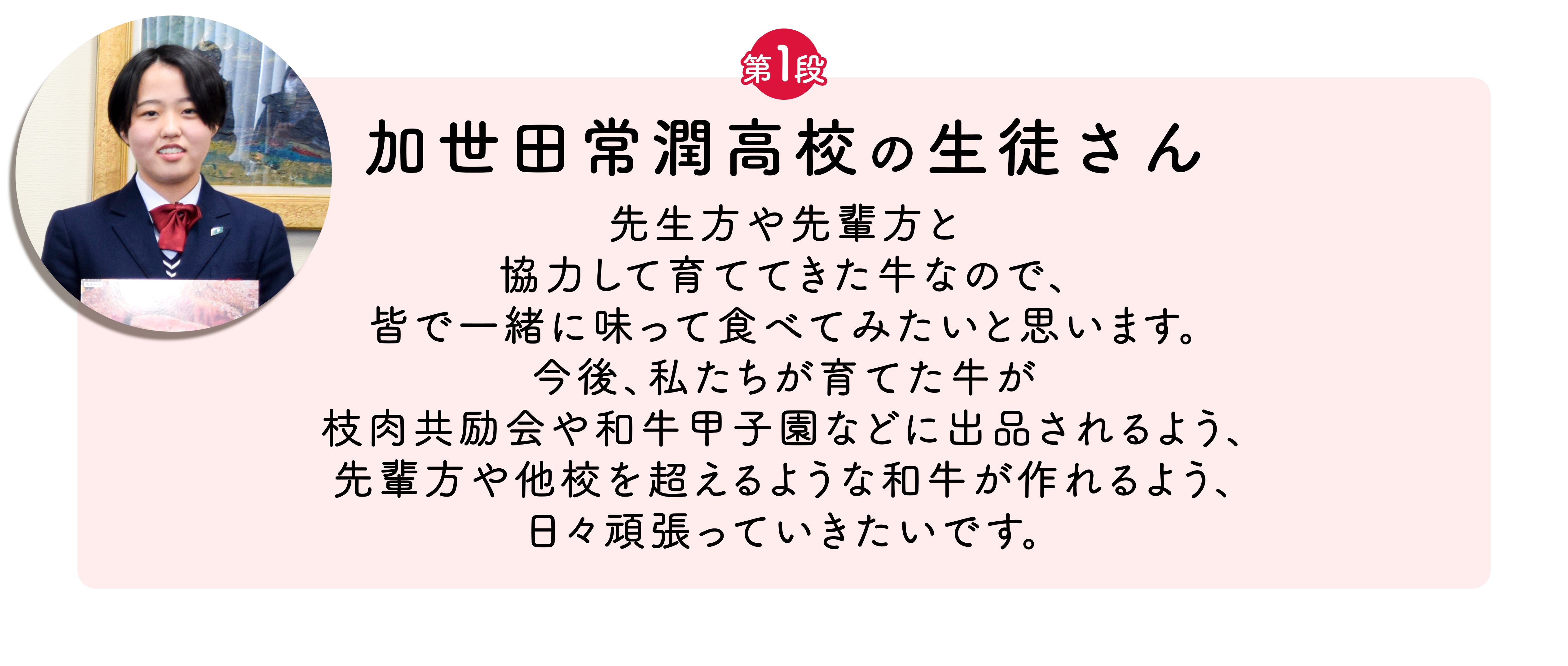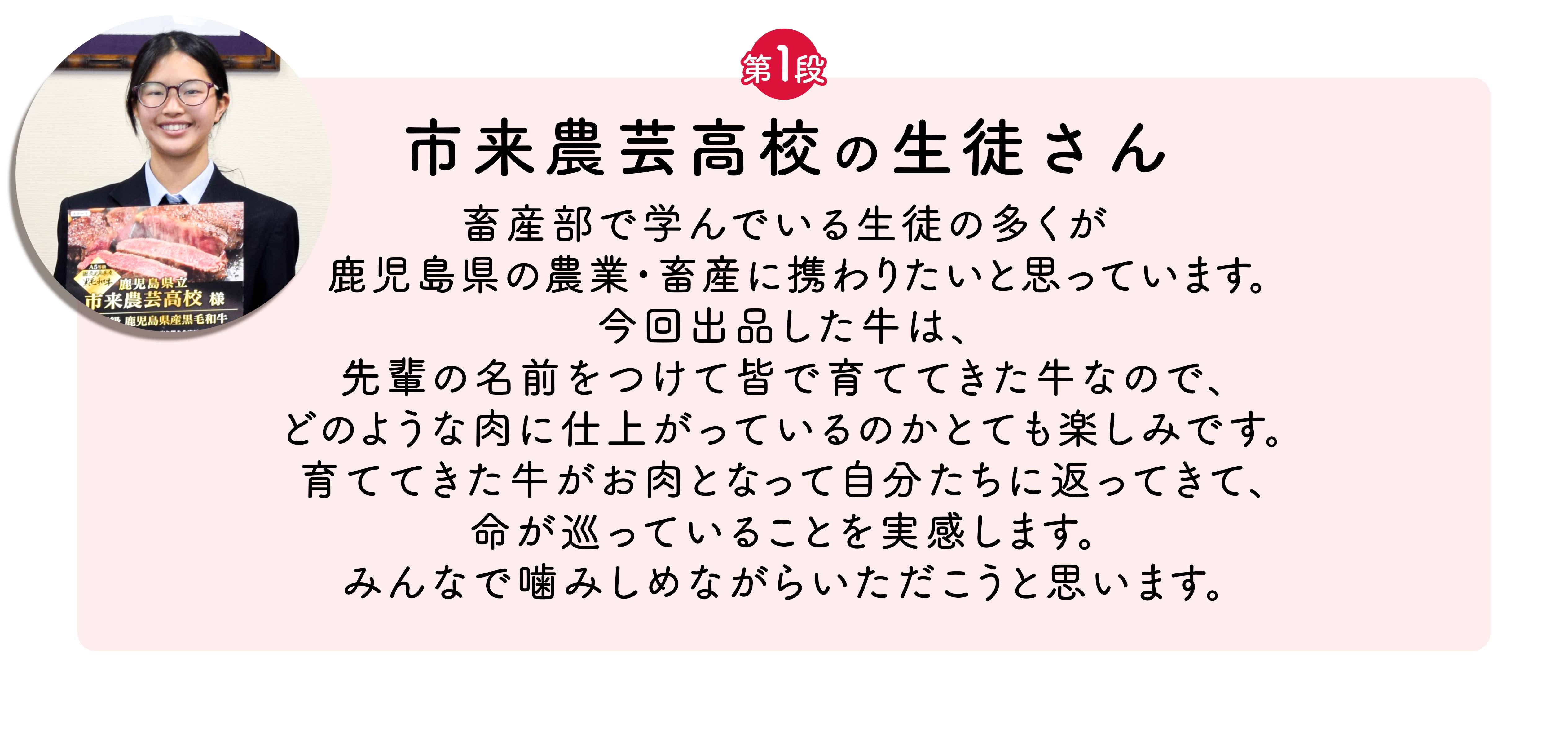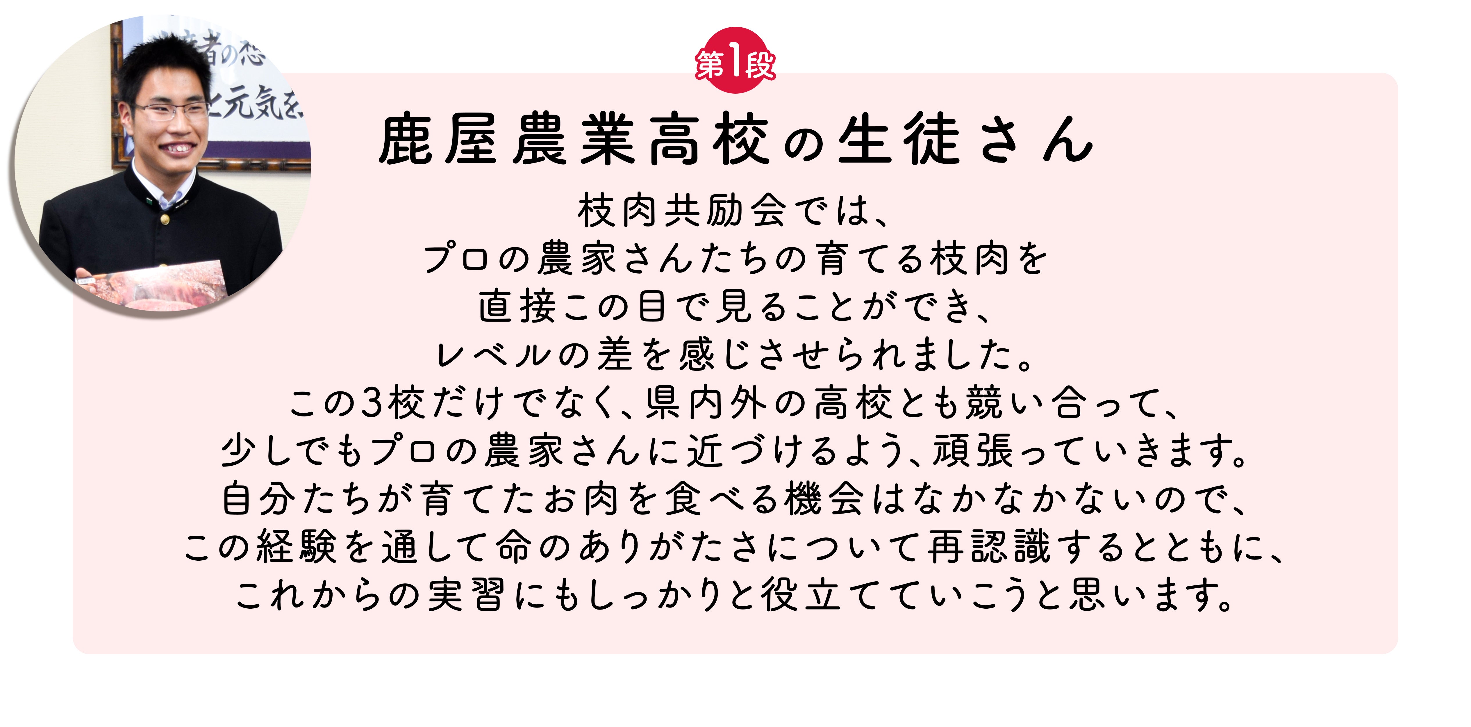 前回のプロジェクトでは、高校生の皆さんに出品牛のお肉を贈呈しました。贈呈式後に高校生の皆さんからいただいたコメントを掲載させていただきます♪