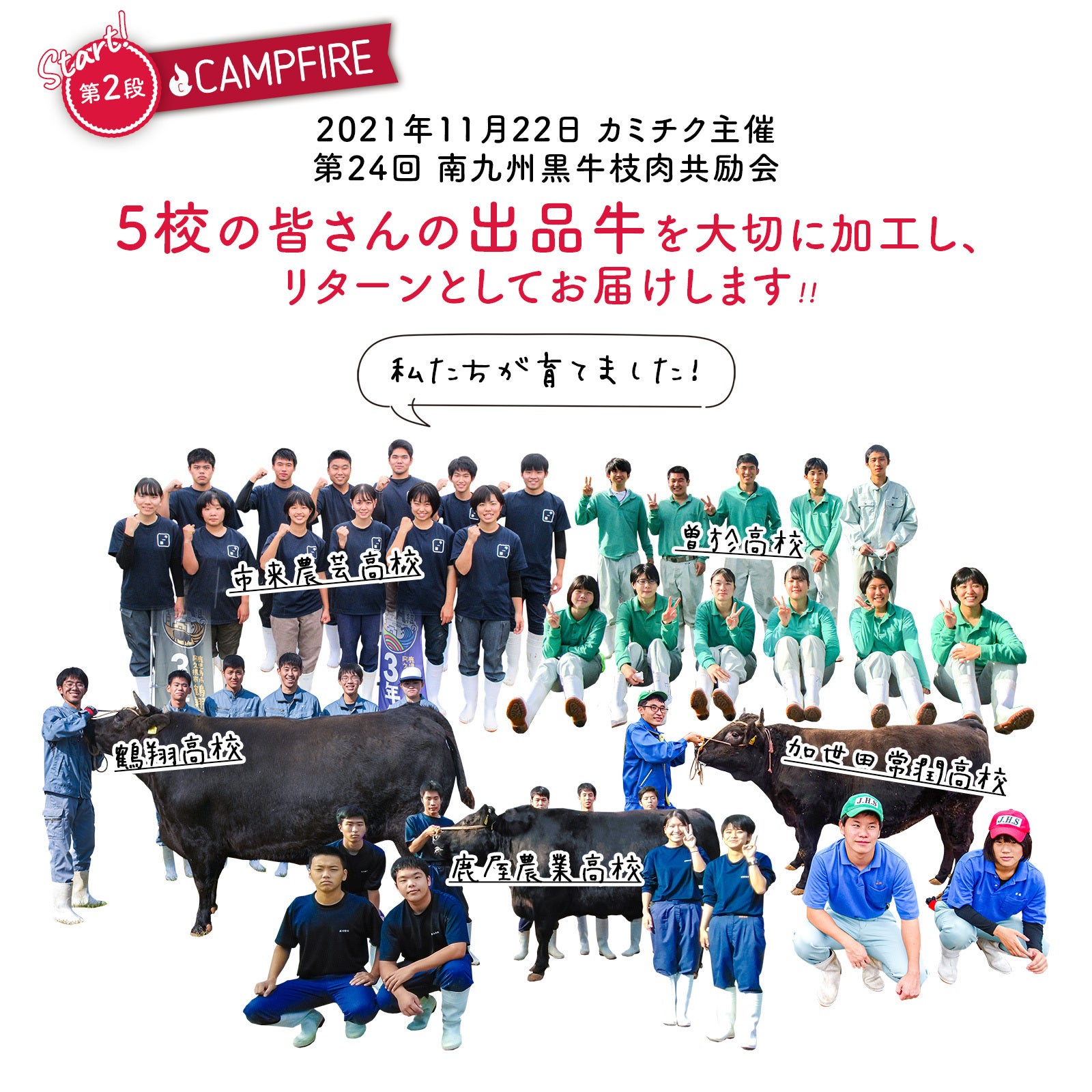 第2段の当プロジェクトでも、皆様からのご支援金を活用させていただき、5校の皆さんにお肉を贈呈します。また、カミチクグループの3次産業を担う九州産直市場の運営する『伊佐牧場 直売所』にて、5校の皆さんのお肉を店頭に並べ、生徒の皆さんに実際に販売を行なってもらう販売体験会を予定しております。