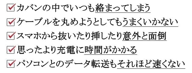 50代女性:物の扱いが雑なので、ケーブルがからまらないこの仕様は嬉しい。端子をなくしてしまいそうなので端子のみで再購入できると嬉しい。