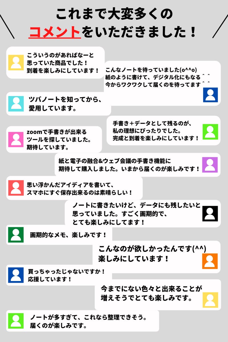 2024/04/16 19:00お世話になっております。MKトレードです。大好評の【ツバメノート社推奨文具】『T-Note2』CAMPFIREのメルマガにて「東京都のおすすめプロジェクト」として紹介していただきました。皆様からのご支援、誠にありがとうございます。スタッフ一同お礼申し上げます。紙ノートの手書きメモやイラストを専用スマホアプリでリアルタイムに「デジタル化」できる『T-Note2』自信をもって皆様にオススメ致します。Webツールやパソコンソフトにも手書きができ、オンライン会議でも大活躍!ツバメノートの『ツバメモA5』が付属します。詳細はこちらから★紙メモを一瞬でデジタル化!PC/スマホと同時描画対応!【ツバメノート推奨電子文具】https://camp-fire.jp/projects/view/749373この機会にぜひご覧ください。引き続き、どうぞよろしくお願いいたします。『T-Note2』プロジェクトスタッフ一同 もっと見る