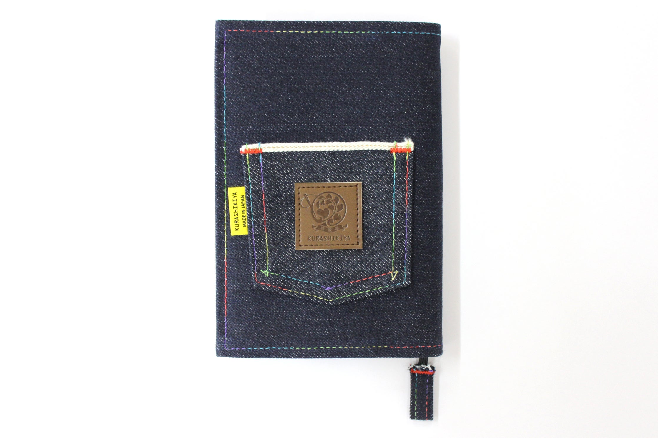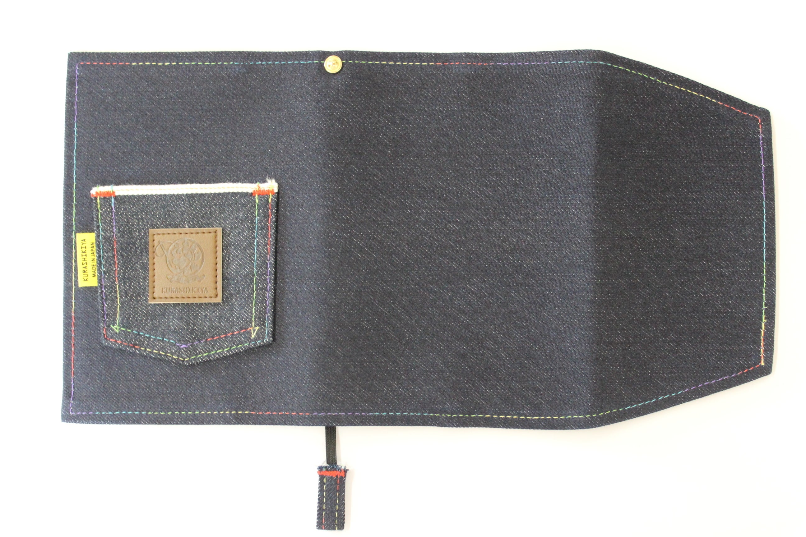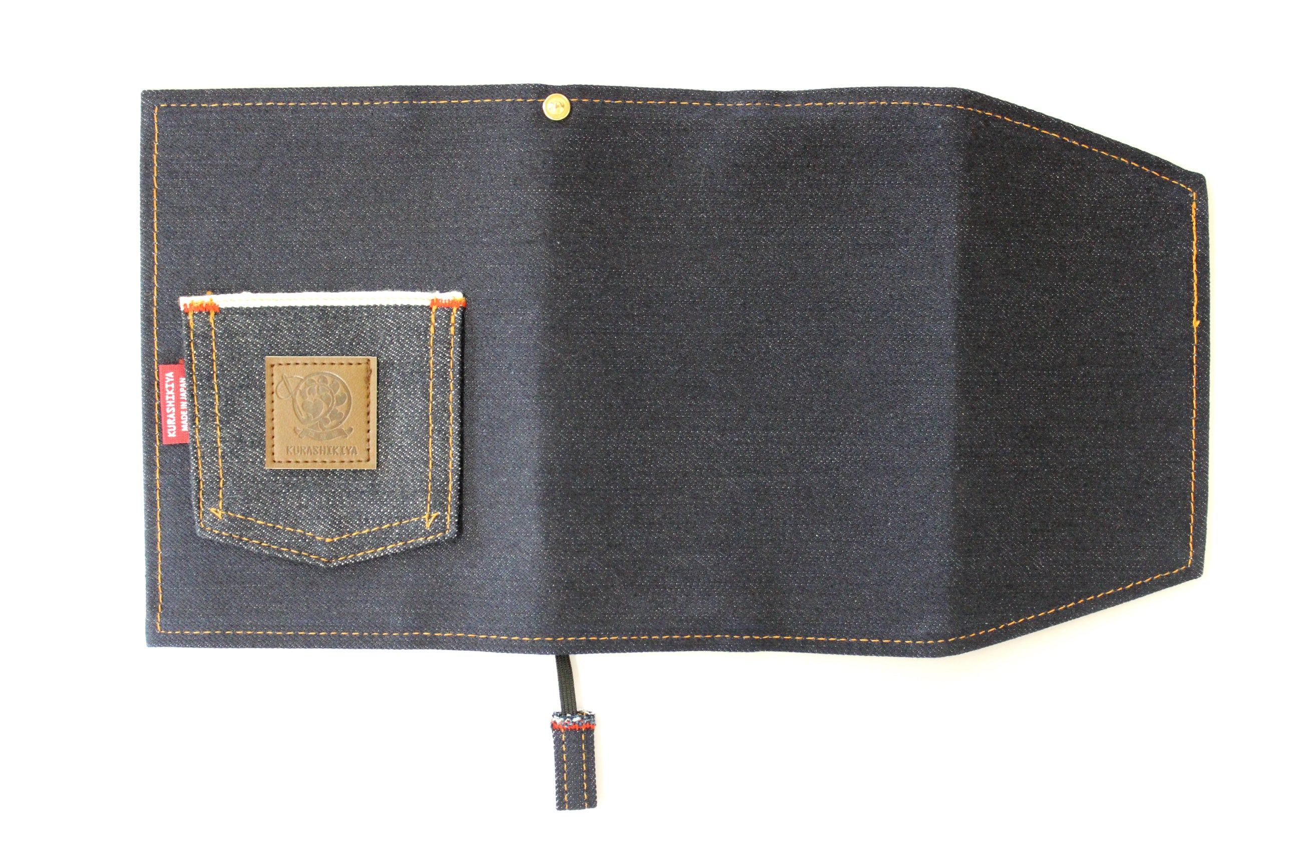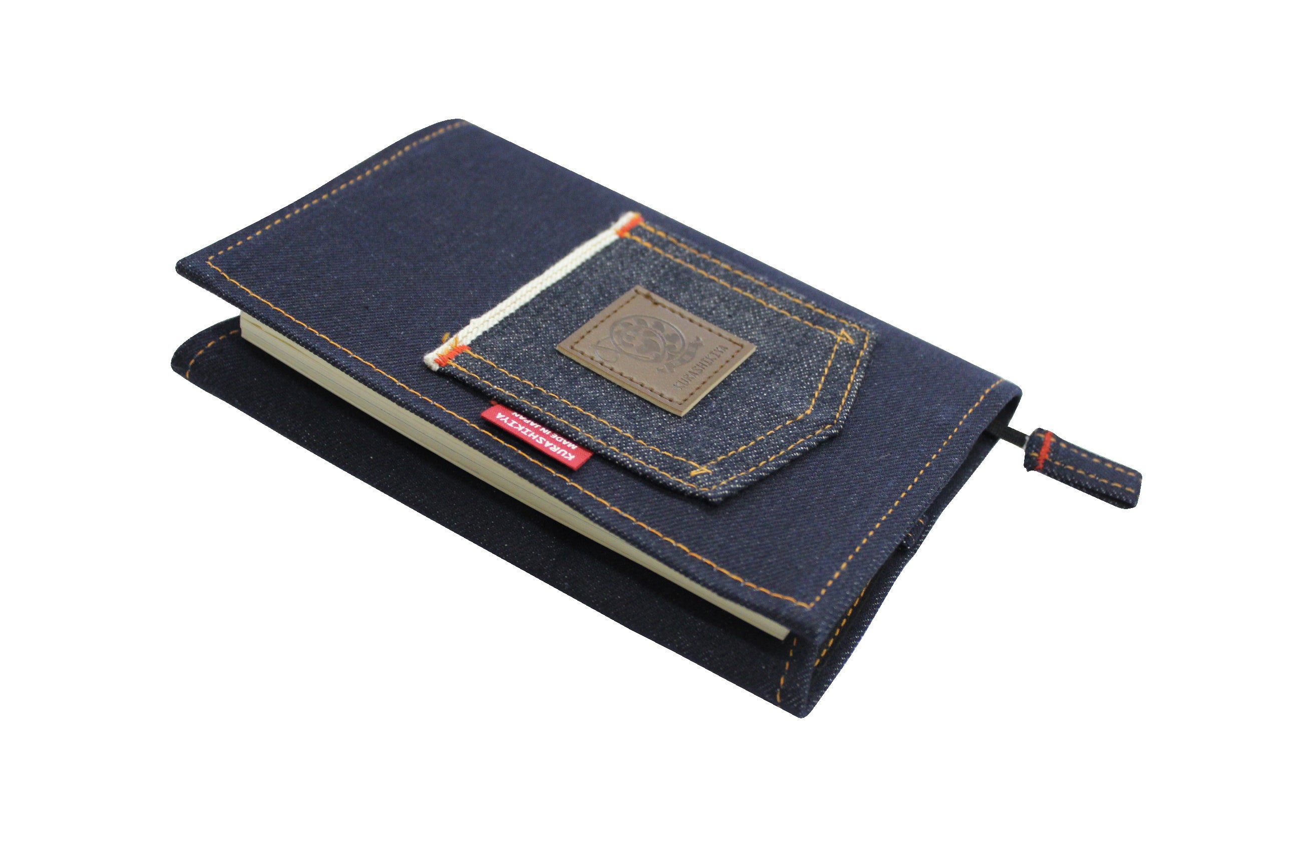 倉敷デニムのセルビッチ生地ポケット付きブックカバーで、