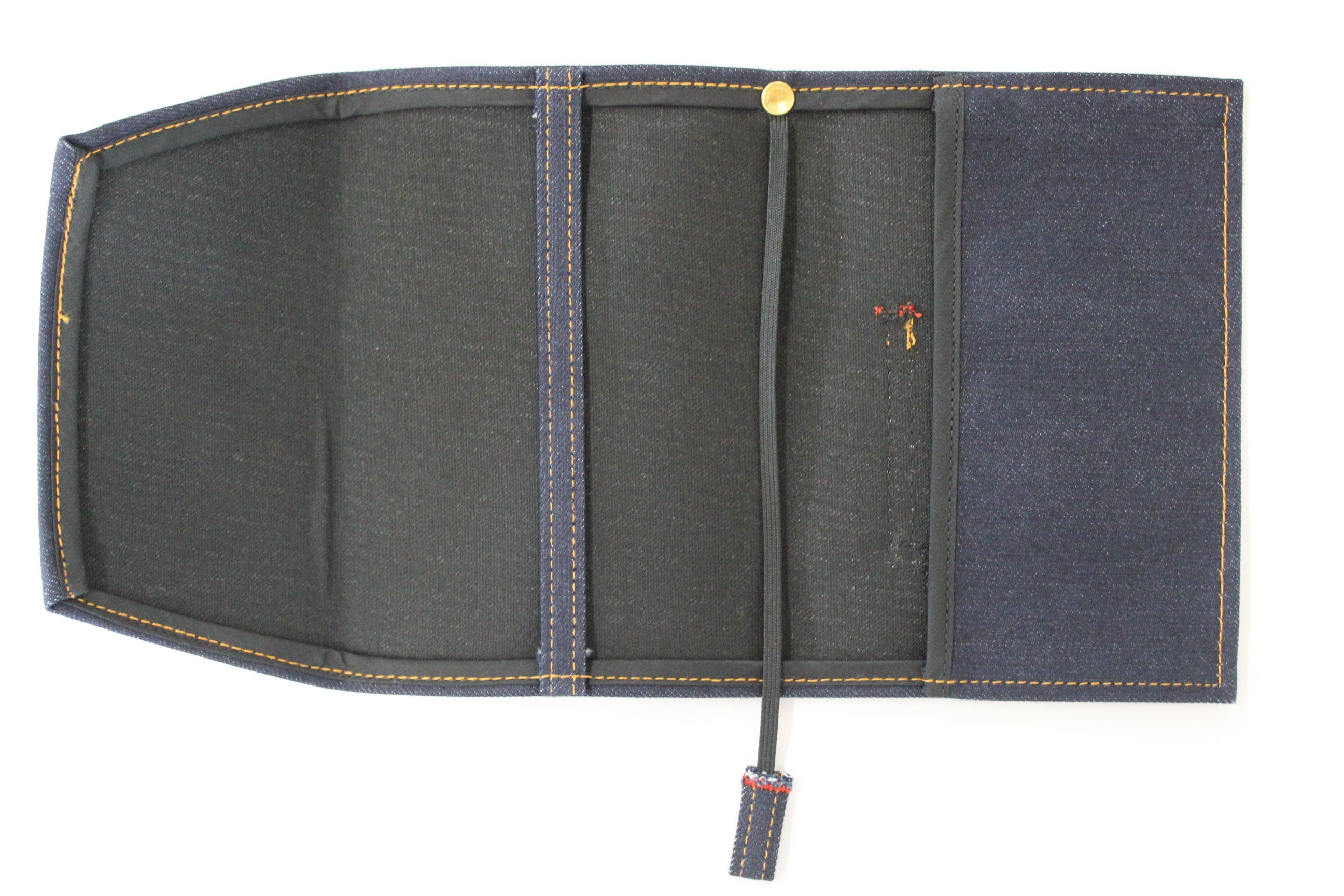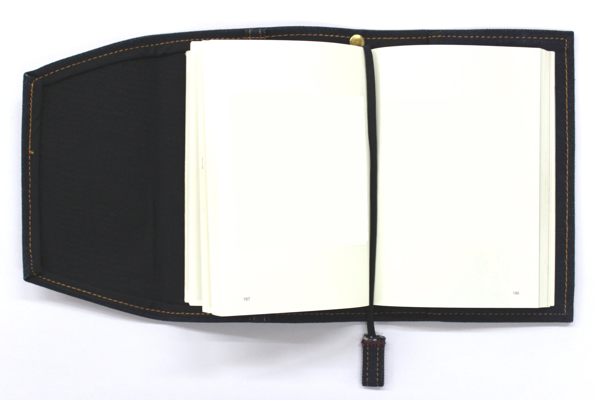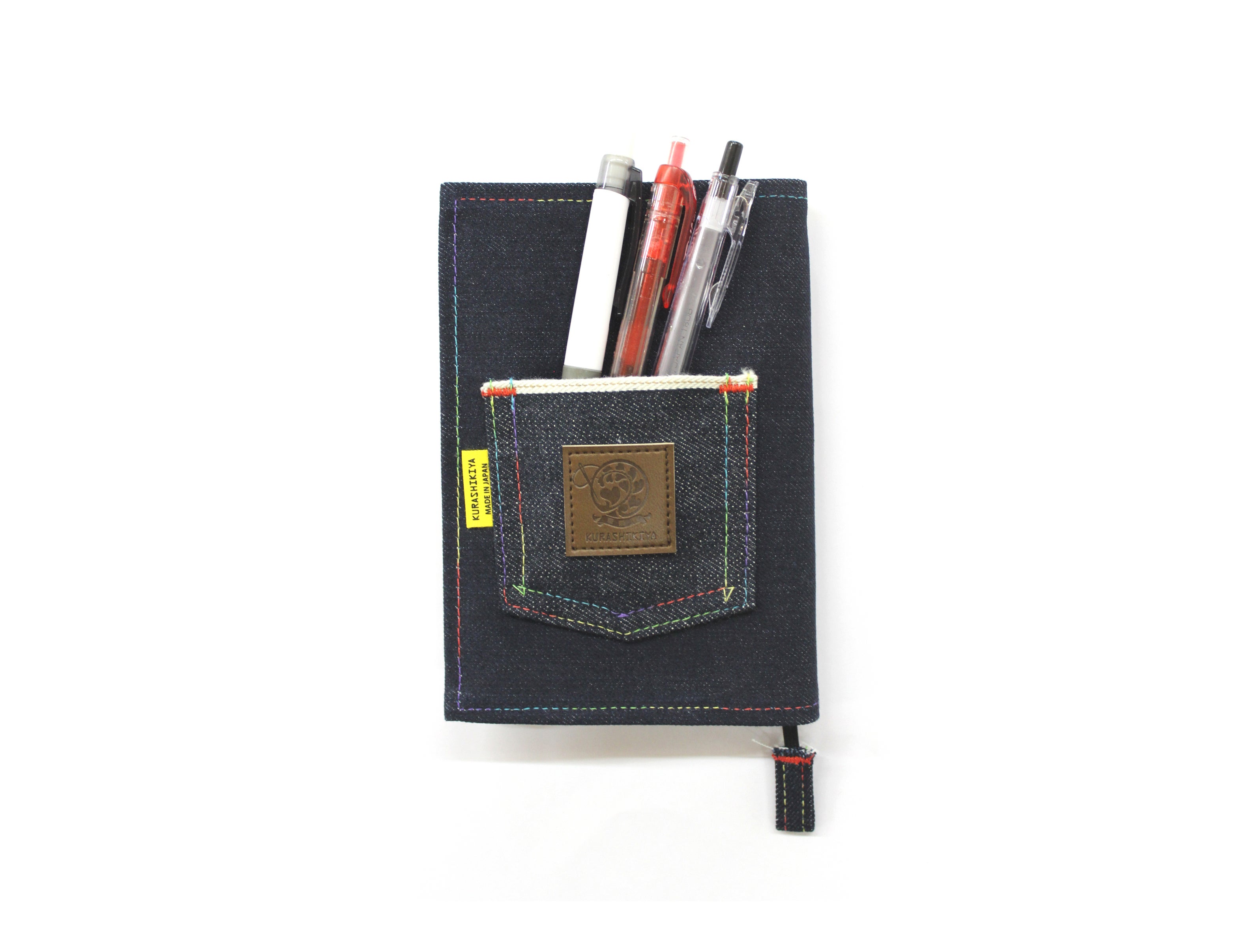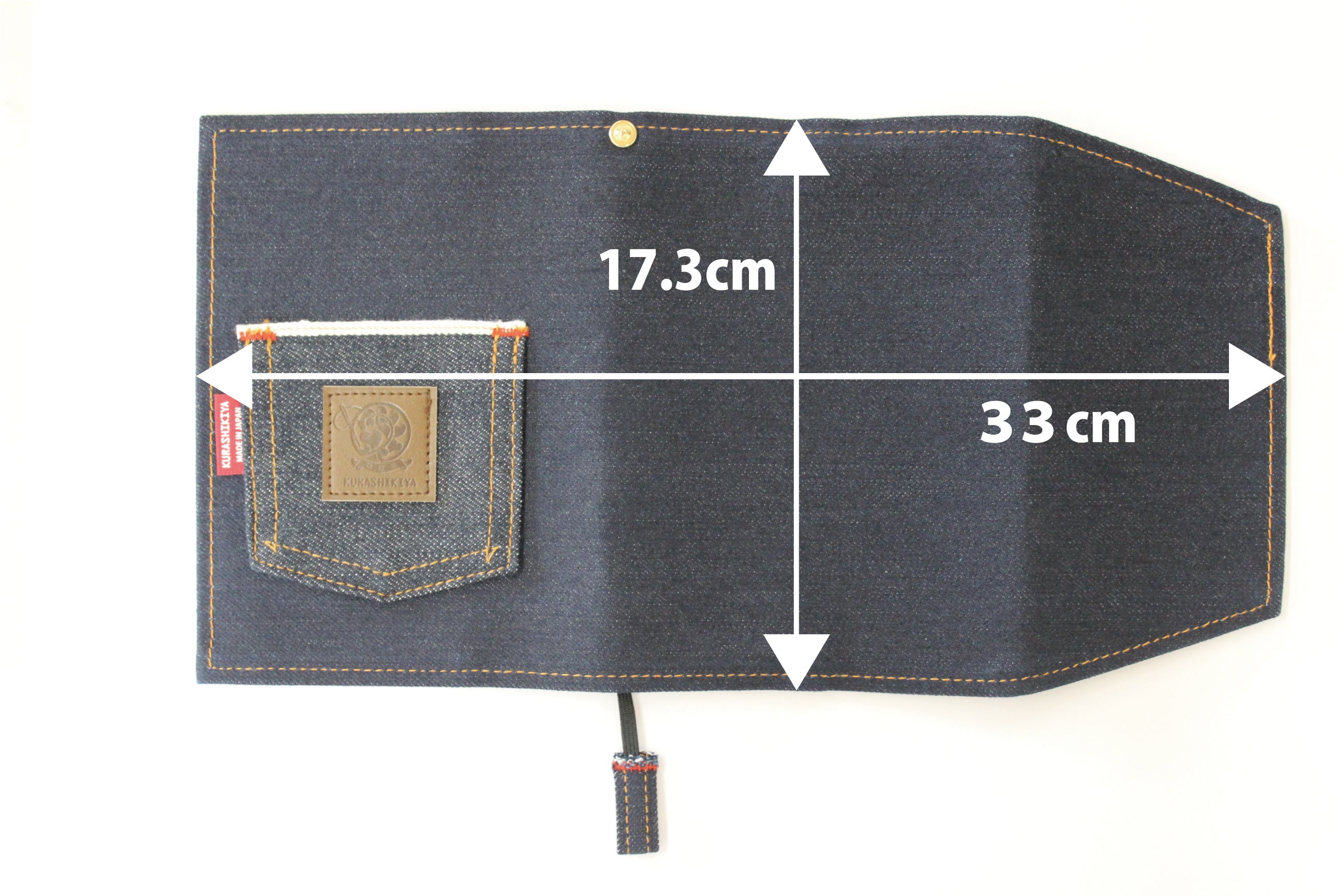 倉敷デニムのセルビッチ生地ポケット付きブックカバーで、