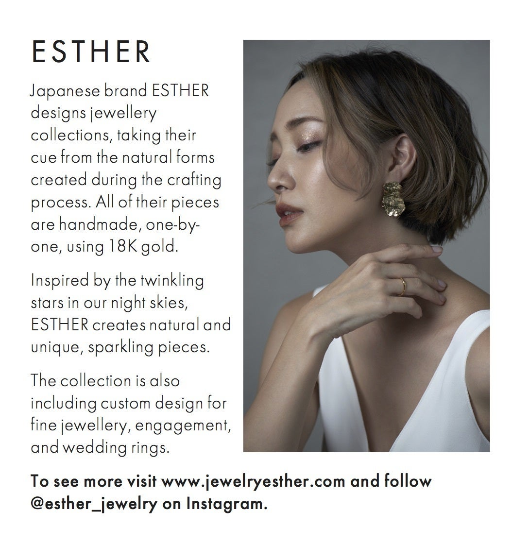 日常の中でESTHERのジュエリーが癒しの存在になったり、決意や目標を託したり、自分を引き上げる存在になったりと、自分をより輝かせてくれるものになるように・・と想いを込めて作製しています。