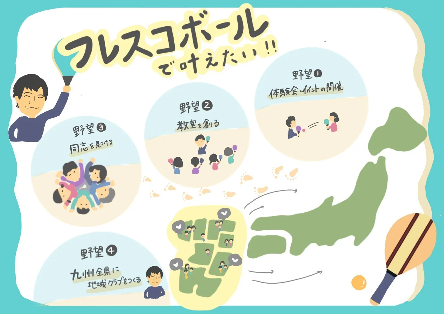 フレスコボールのスクールを創ったり、体験会・イベントを行ったり、、、それらはもちろん福岡県外でも活動的にやっていくつもりです。