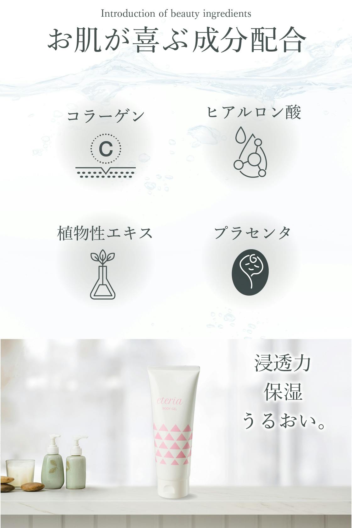 お肌で悩む世の女性たちの手助けをしたい、喜びを届けたい、そんな想いからボディジェルの開発を行いました。潤うお肌を目指す女性たちにとって、eteria BODY GELが少しでも手助けになれば幸いです。