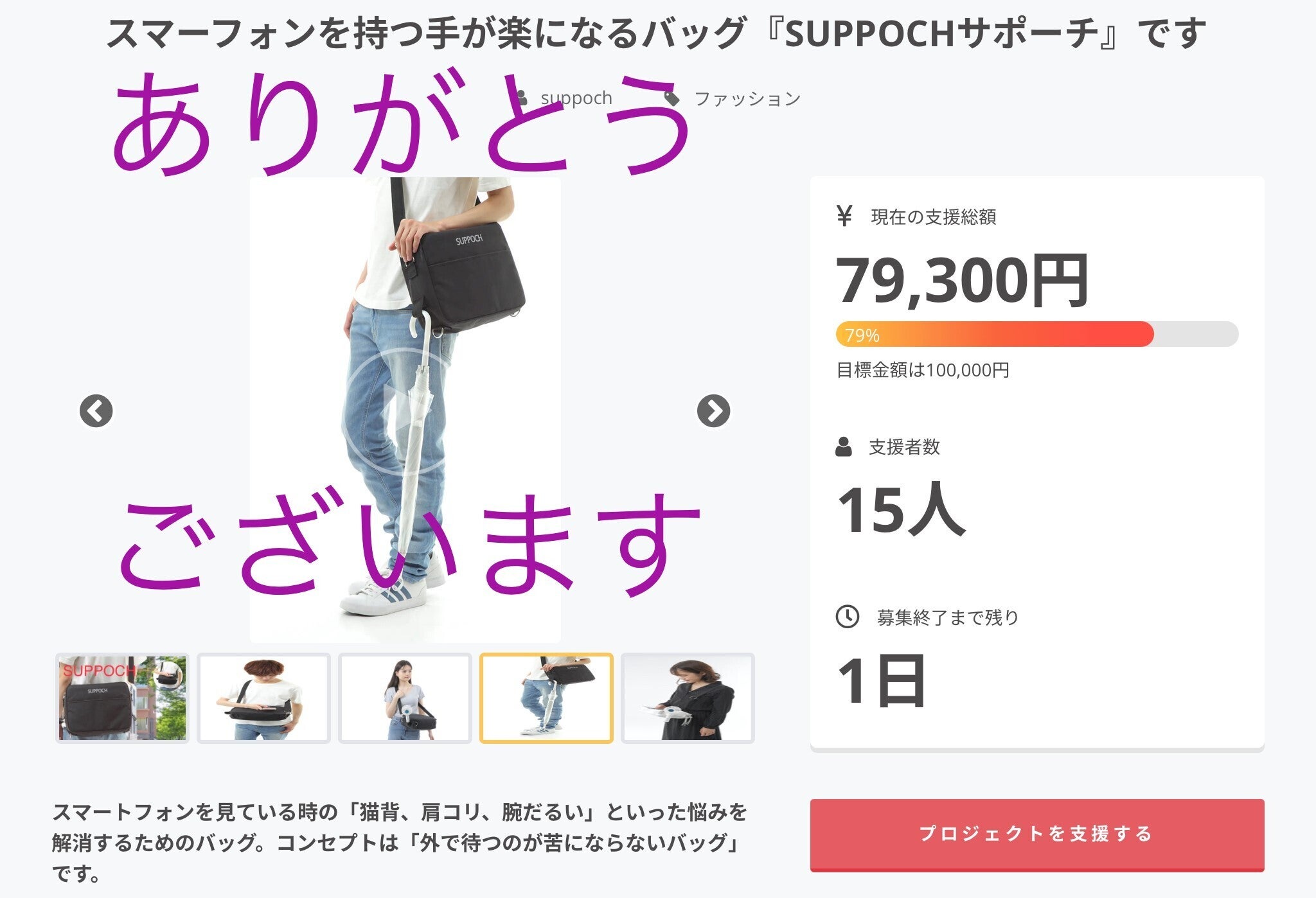 いつもありがとうございます。本日でいよいよサポーチのクラウドファンディングが終了致します。大変ありがたい事に、目標金額の10万円を達成出来ました!これもひとえにご支援、ご協力下さった皆様と、支えて下さった皆様のおかげ様です。ありがとうございます。私の商品は正直、大手企業さんの商品ほど立派なものではないかもしれません。コストパフォーマンス的にも劣っていて、このプロジェクトのページもプロの方の制作ではなくパソコンに不慣れな主婦が一生懸命ポチポチしながら(時には心が折れながら)長時間かけて作成しております。なので大変見づらい部分もあったかと思います。活動報告の期間が空いた時には、仲間の先輩からの叱咤激励をいただきまた前向きになりました。そして皆様のお気持ちに応えたくて頑張れました。反省点は多くあったものの、ありがたい気持ちと充実感を頂けております。以前のご報告の投稿にも載せた通り、初めは気合は入っていたものの、不安で不安でしょうがありませんでした。しかし皆様のおかげで、喜びの気持ちに変われる事が出来ました。しかしここでゴールではありません。これからも、ご利用下さる方々がもっともっと便利に使えるバッグを目指して改良、改善していきたいと思います。その様子をブログに記していきたいと思いますのでご覧いただければ幸いです。suppoch.net これからも SUPPOCH サポーチをどうぞよろしくお願いいたします。最後に改めまして本当にありがとうございました。