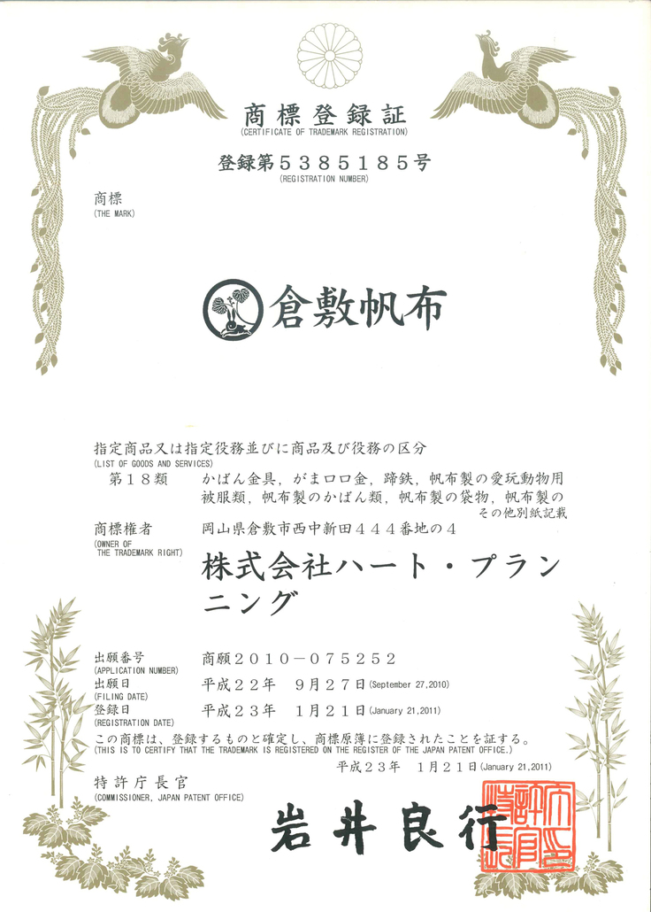 また平成23年には、『倉敷帆布』の商標を取得しました。