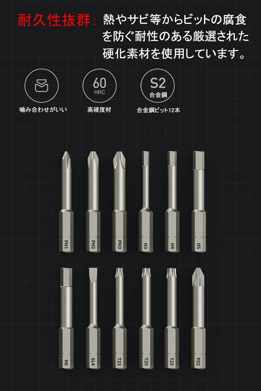 ビットにはクロムバナジウム合金鋼よりもさらに硬度を高めたS2鋼を採用しています。12種類のビットも入ってるので、日常の修理などの場合は最適です!