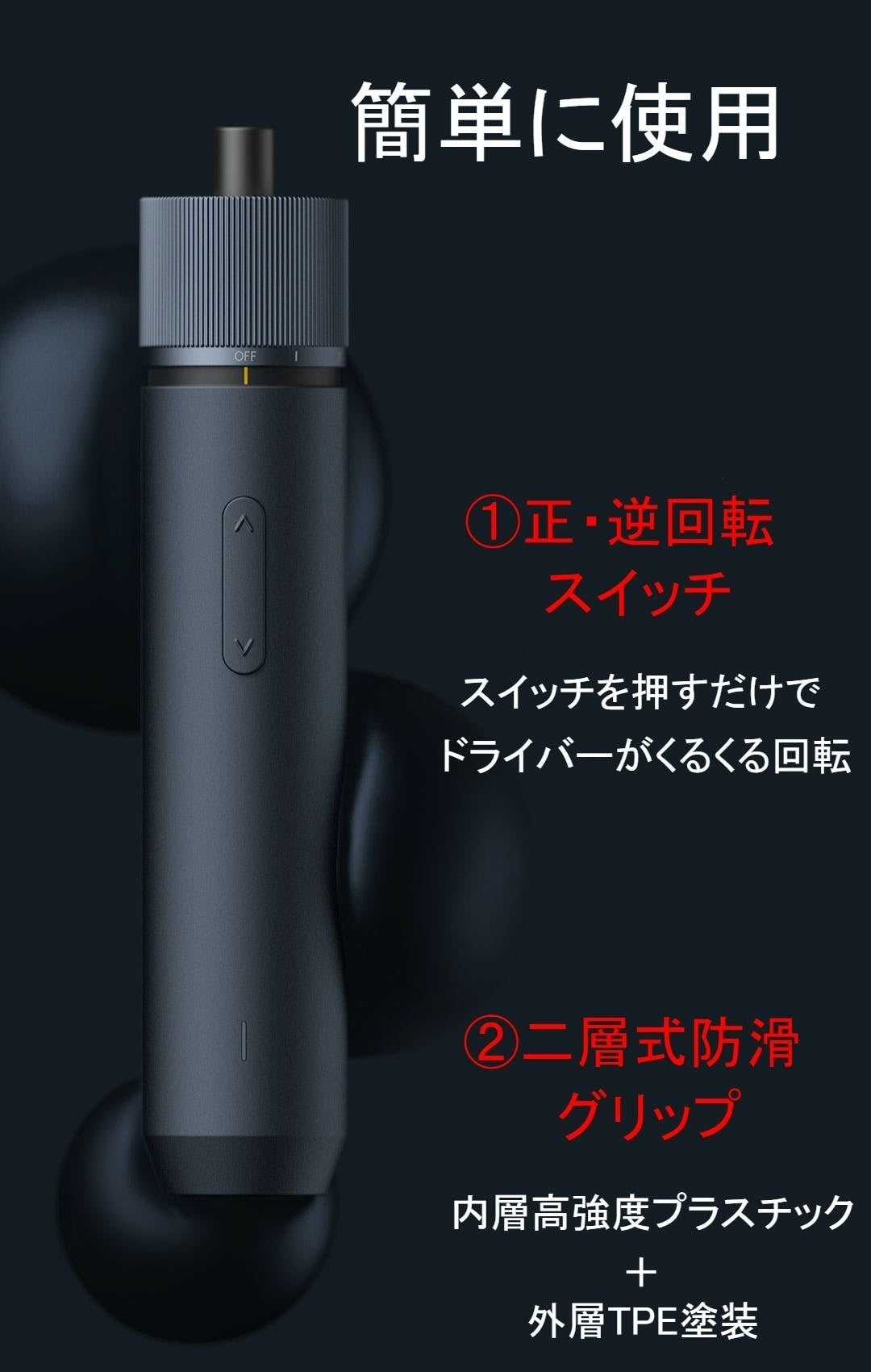 ボタン操作でネジの締める/緩めるを切り替え指先で押すだけて正逆回転を簡単に切り替え、片手でもストレスなく使えます。