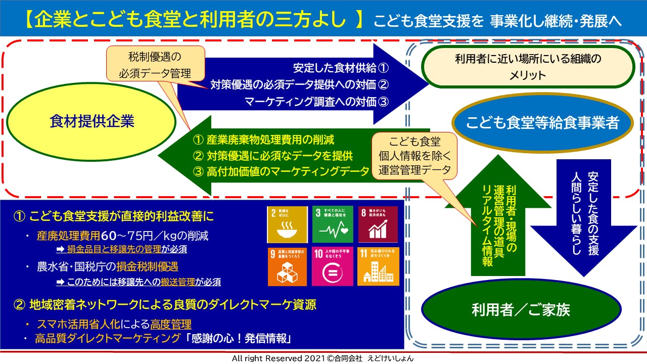 その損金に関わる税制優遇申請時に必要なデータを私たちが提供することで、企業が利益を得られ、その対価を私たちこども食堂が受け取り活動資金とする。