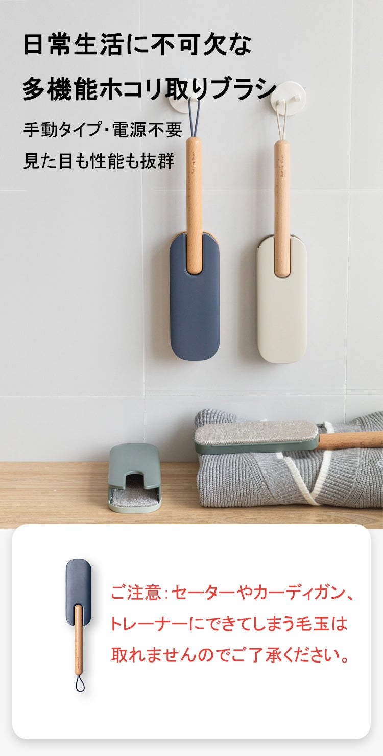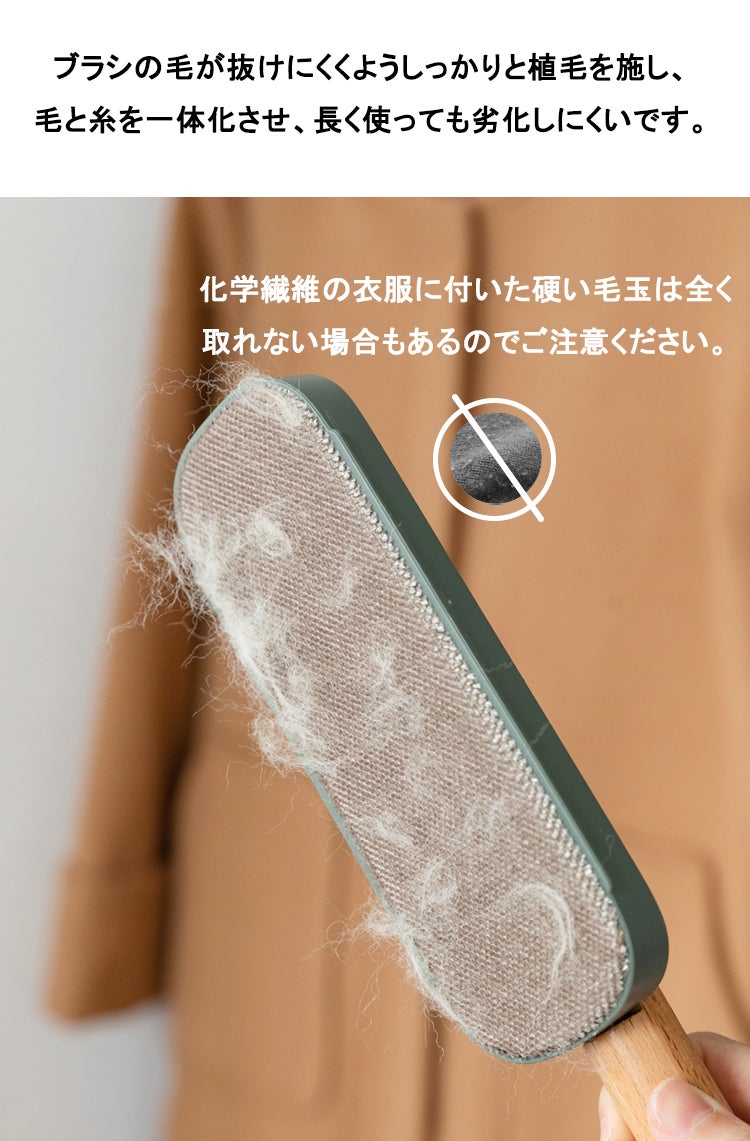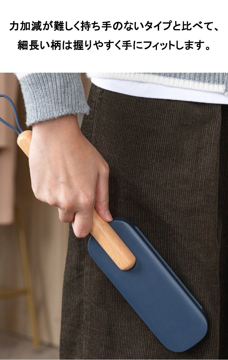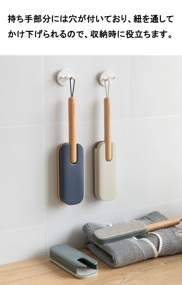 洋服ブラシは馴染みやすい天然木を採用し、人間工学に基づいた持ちやすいグリップ、滑り止めがついているので、手から落ちにくい設計仕様で女性でも持ちやすいサイズ感を実現しました。持ち手はなめらかな曲線でブラッシングする時の力がよくコントロールできます。持ち手部分には紐を通す穴が開いていて、紐も付属されてます。玄関にかけて収納することはできます。