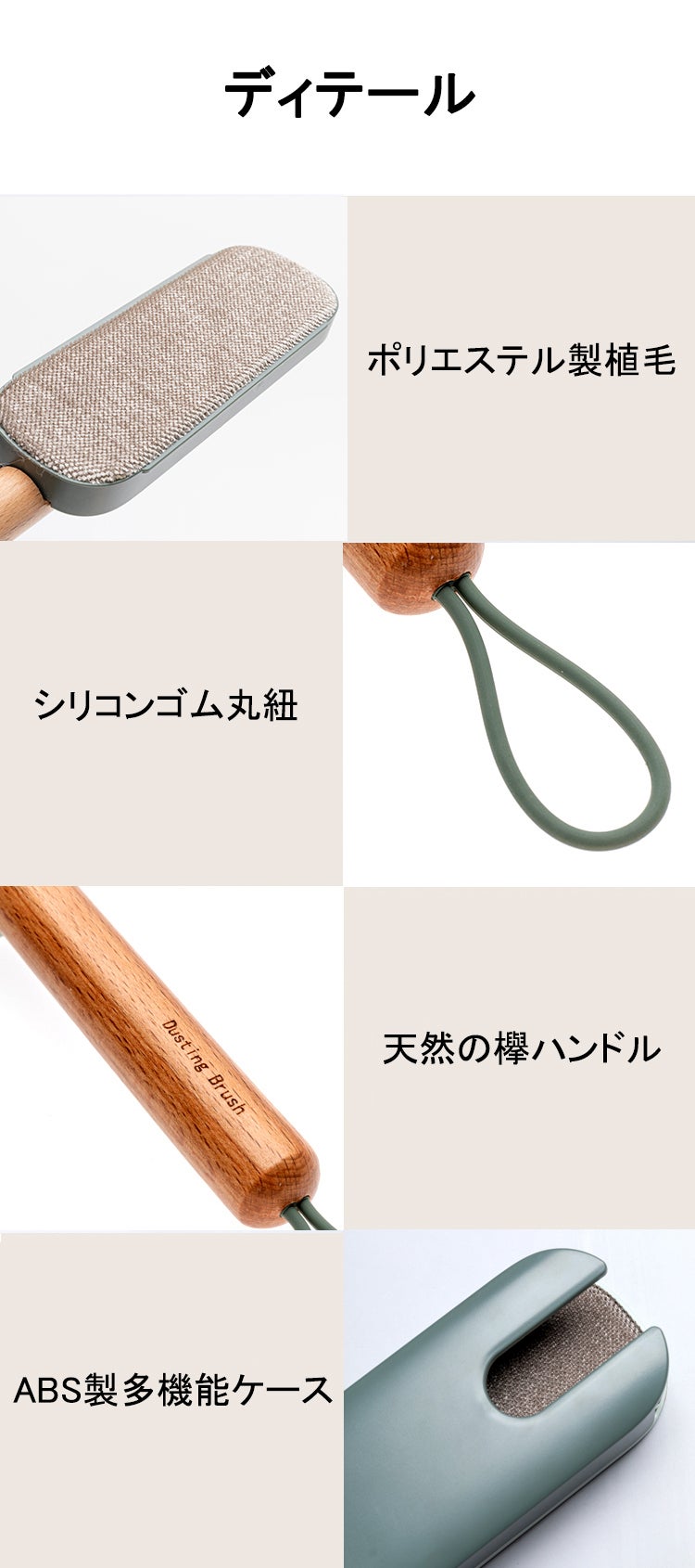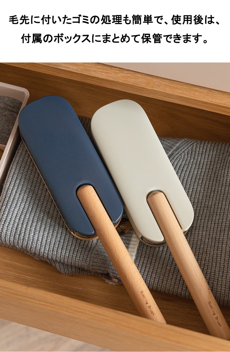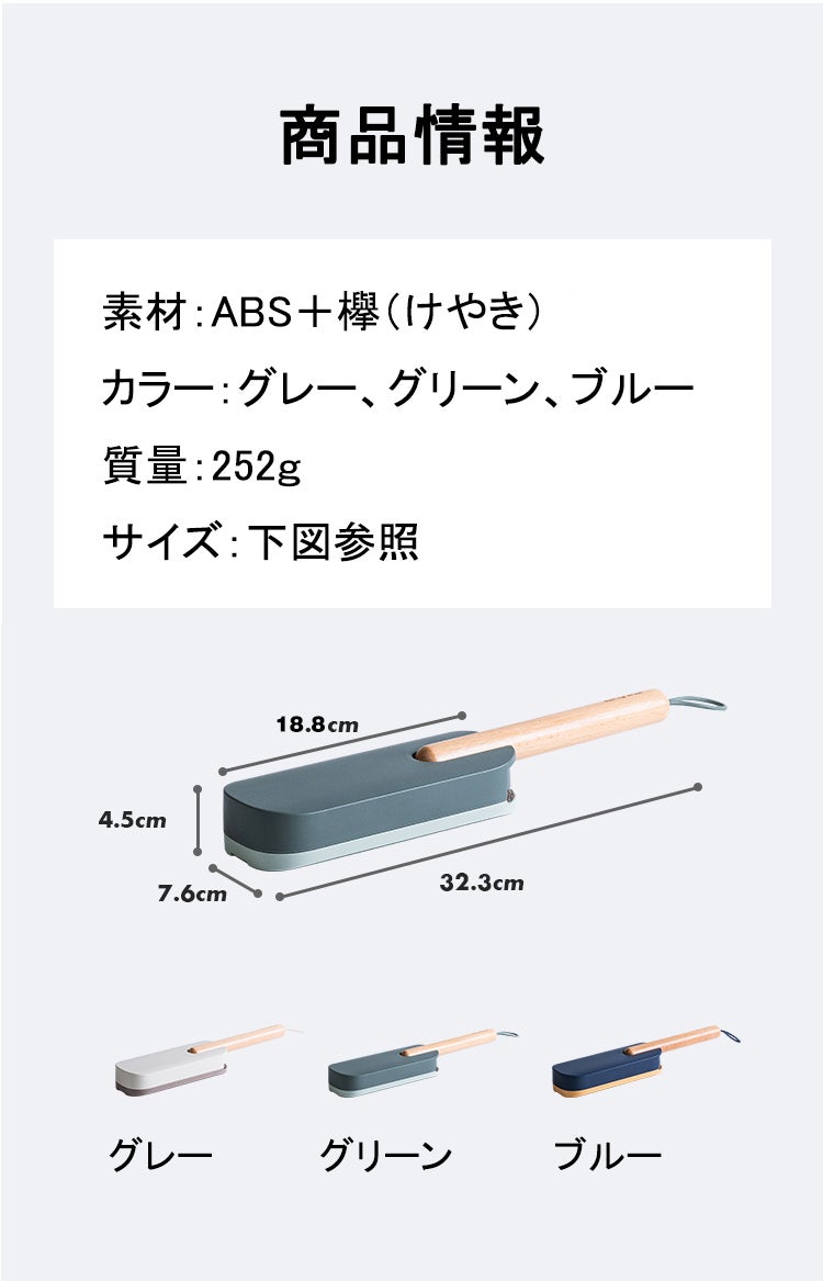 洋服ブラシは馴染みやすい天然木を採用し、人間工学に基づいた持ちやすいグリップ、滑り止めがついているので、手から落ちにくい設計仕様で女性でも持ちやすいサイズ感を実現しました。持ち手はなめらかな曲線でブラッシングする時の力がよくコントロールできます。持ち手部分には紐を通す穴が開いていて、紐も付属されてます。玄関にかけて収納することはできます。