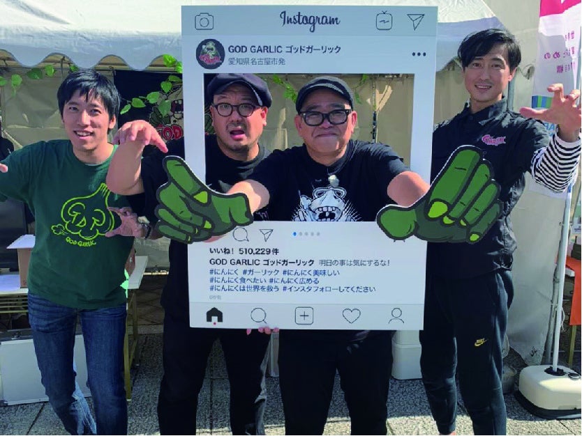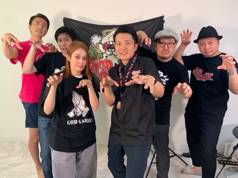 また、我々は「にんにくをサブカルチャーとして発信する」ことに軸足を置いていることから、GOD GARLICオリジナルのアパレル商品を多数展開しております。現在は、滝沢カレンさん公認のものまね芸人らりるRIEさん、「アクセルホッパー」として一世風靡した永井佑一郎さん、お笑いコンビ「ブロードキャスト!!」の吉村賢二さんと、それぞれコラボTシャツを企画・販売し、いずれも大ヒットしております。
