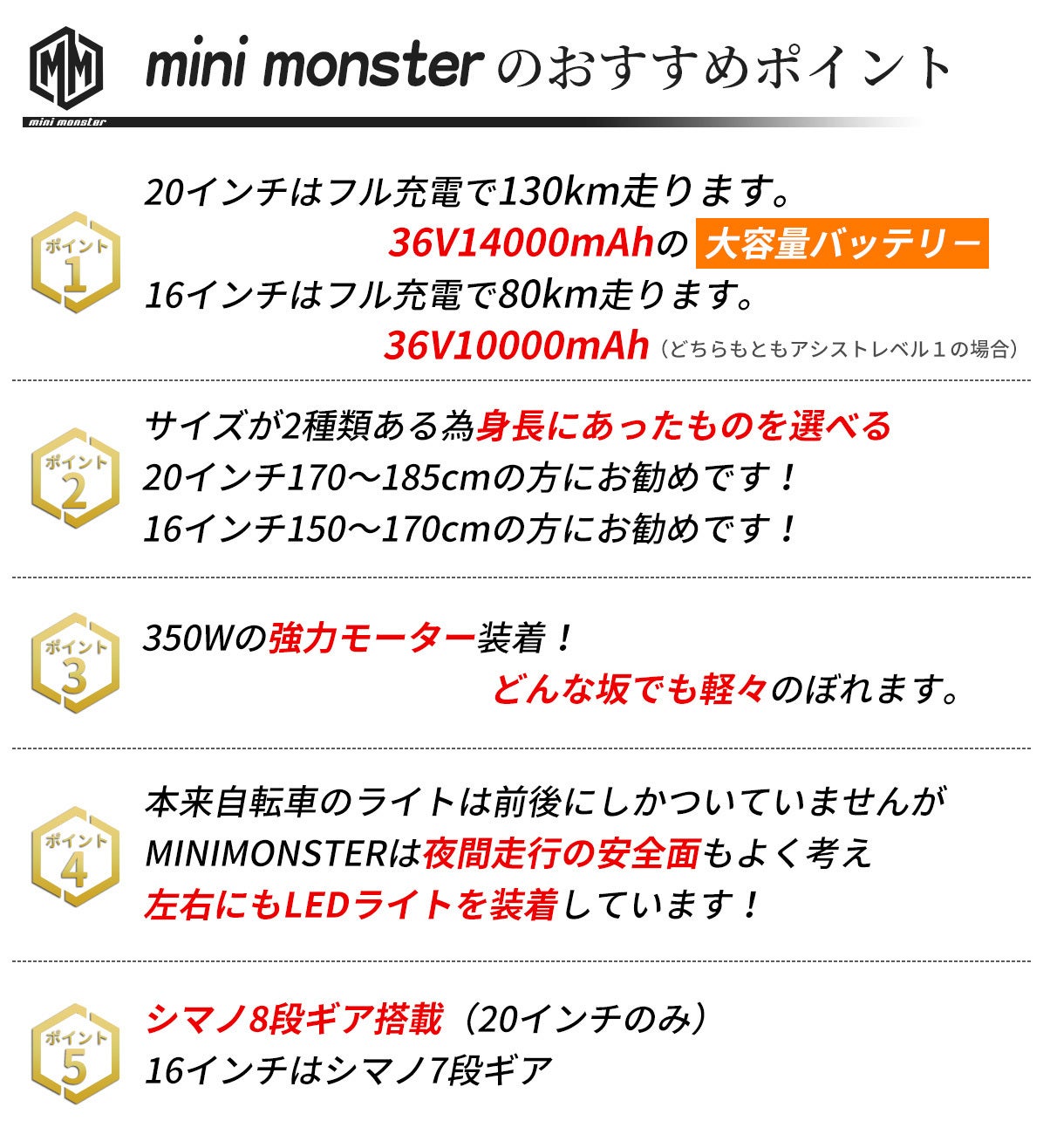 ですが、MINIMONSTERはどうでしょうか? 「MINIMONSTER」は夜間でも安全に走行することができます。