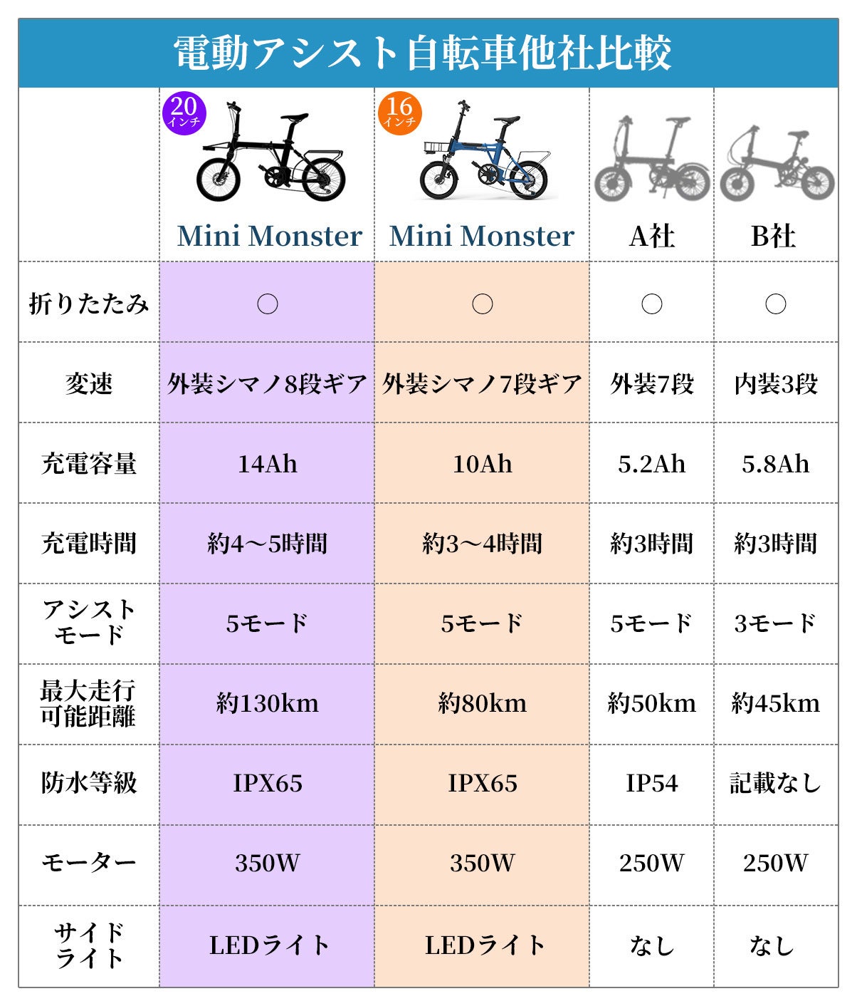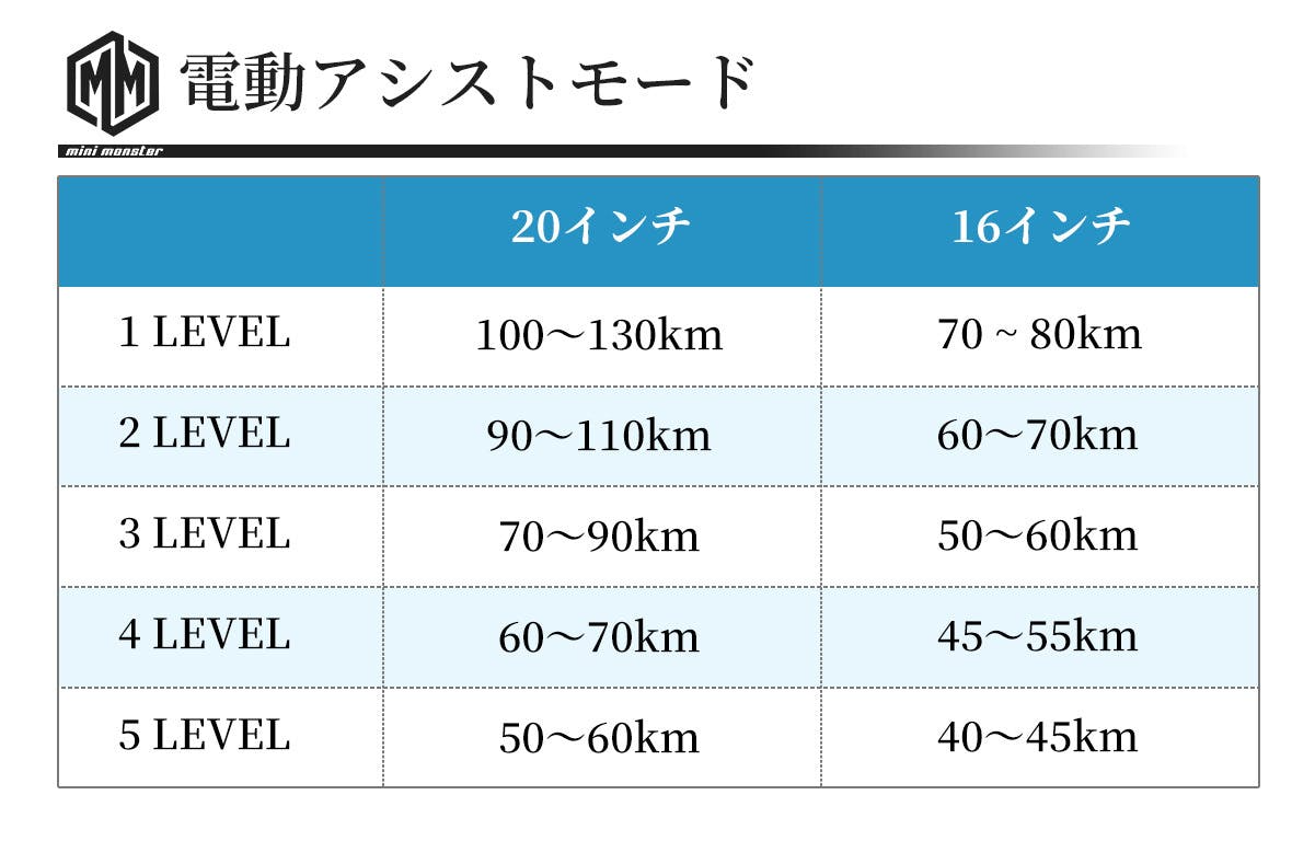 36V14AHのバッテリーを使用しているので充電満タンで最大130KMも走れます! 16インチの場合でも他製品の電動アシスト自転車とは全く違います!36V10AHのバッテリーを使用していて充電満タンで最大80KMの走行が可能です。MINIMONSTER20インチと比べると少し劣りますが他社の電動アシスト自転車と比べると差は歴然です!